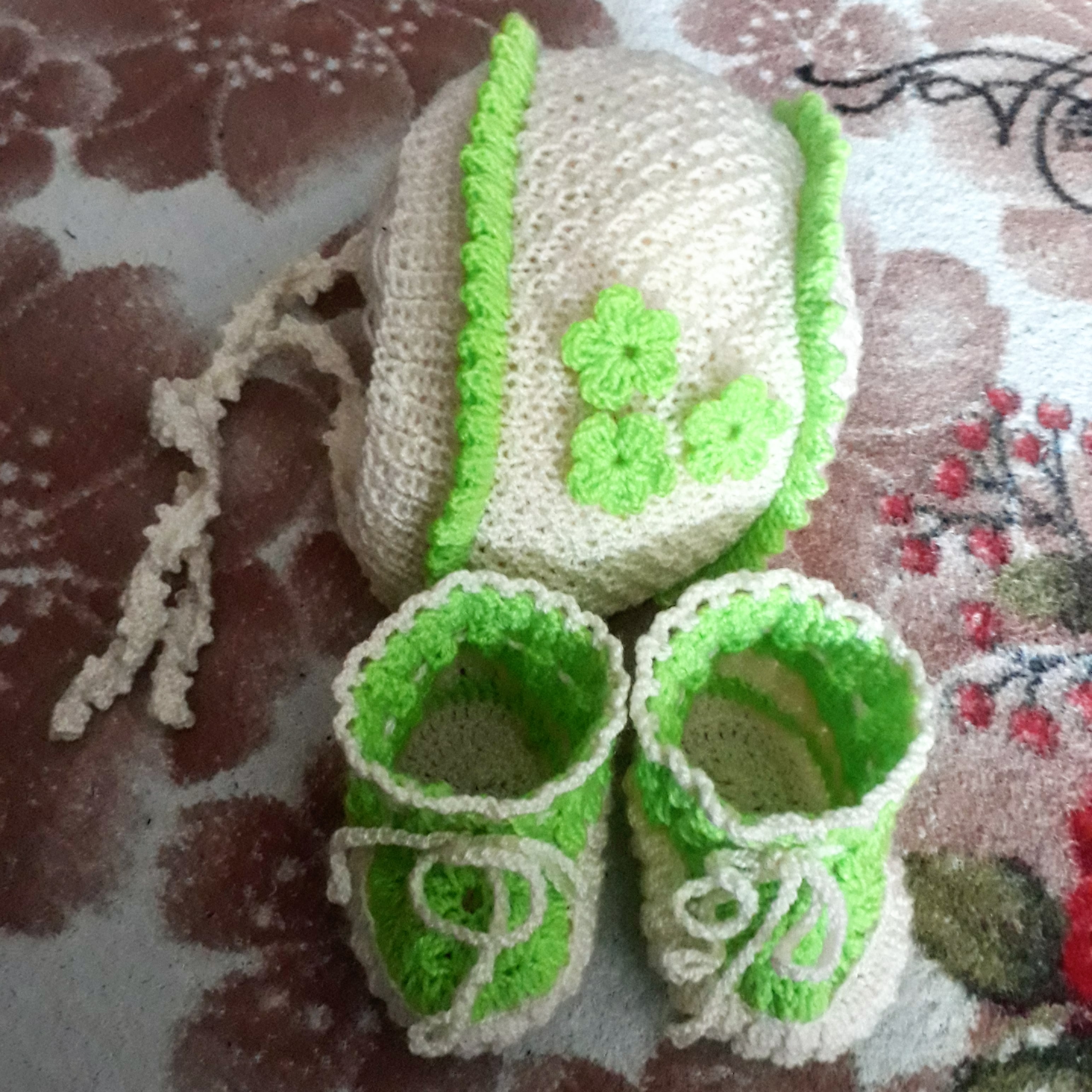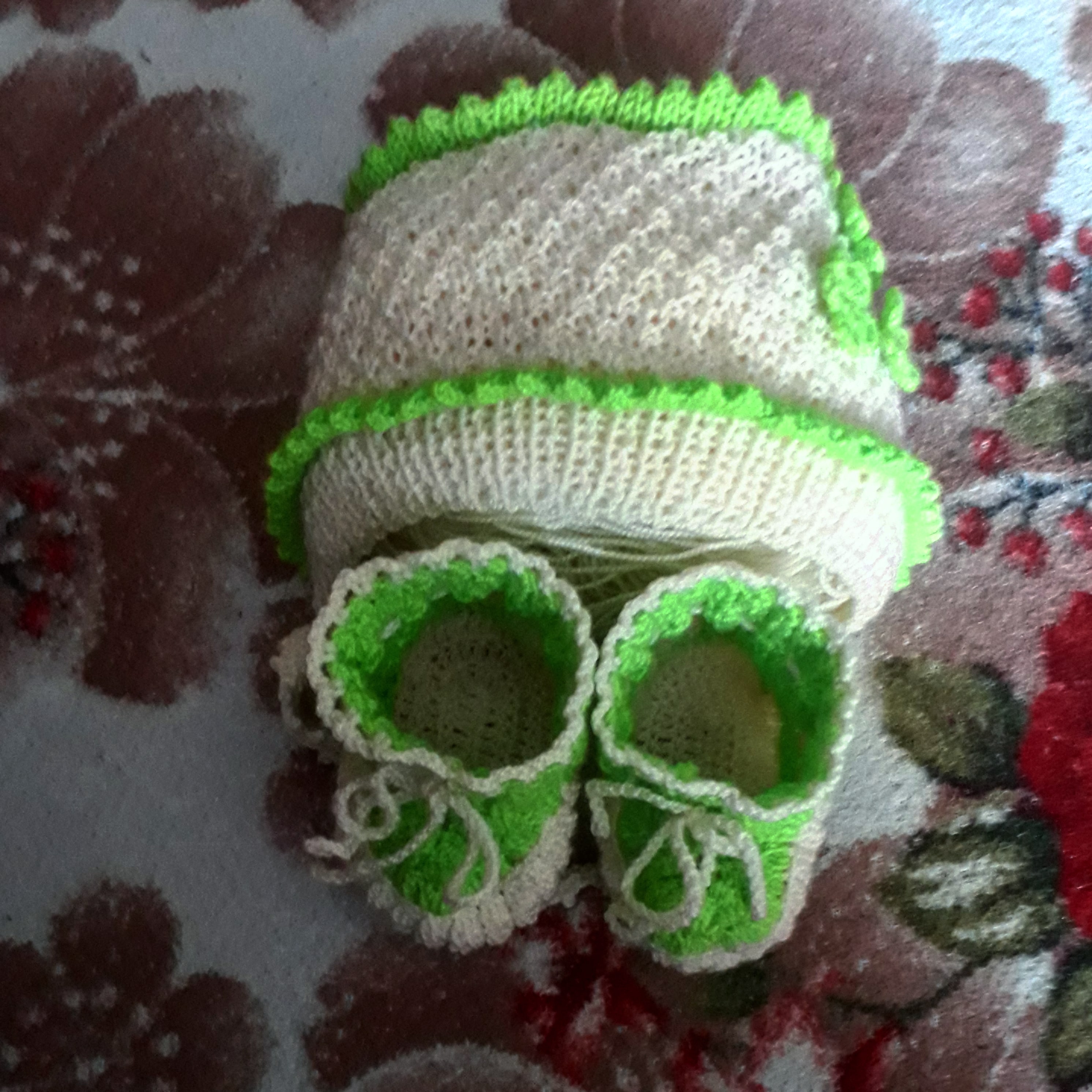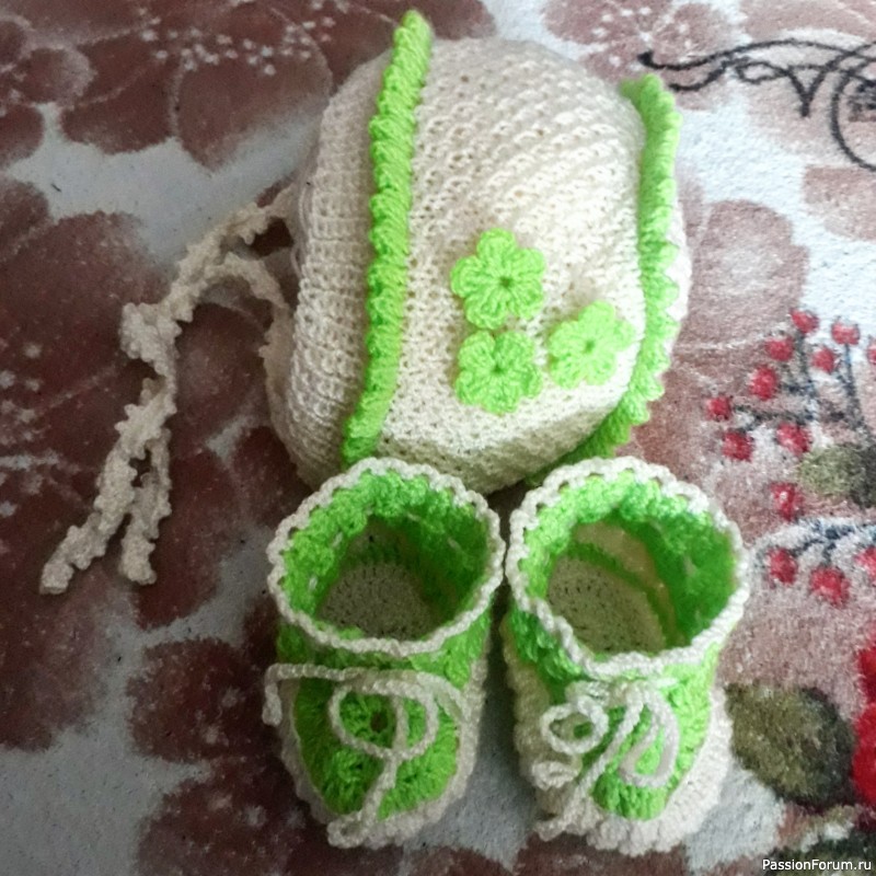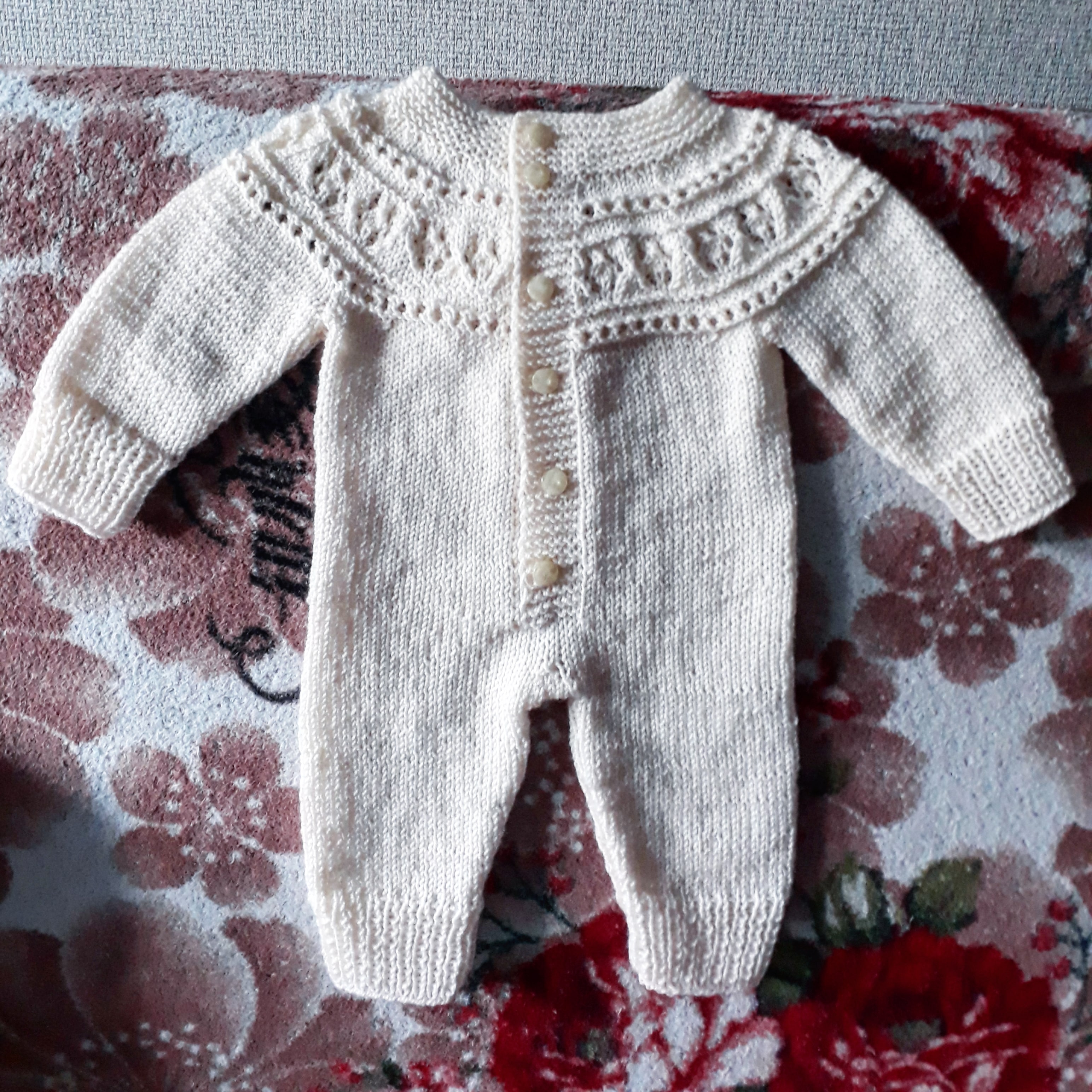 Спицами связала комбинезон и чепчик, крючком пинетки.