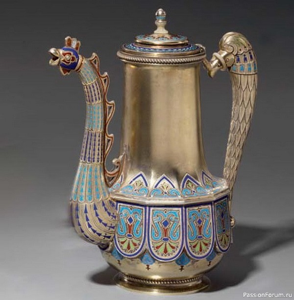 Серебряный позолоченный кофейник, украшенный выемчатой эмалью, с носиком в форме головы и шеи мифической птицы, с ручкой в форме крыла, высота 20 см, Хлебников, Москва, 1879 г.