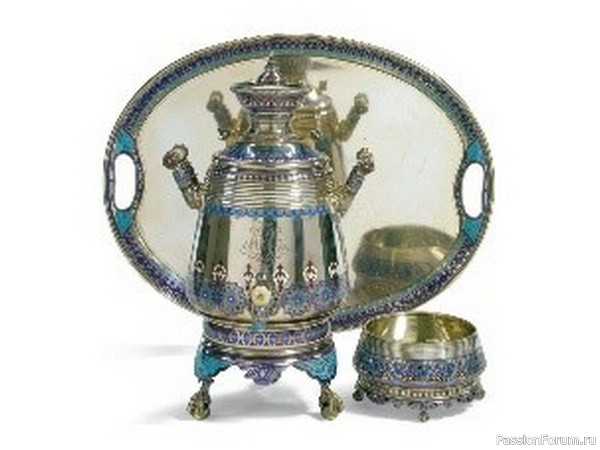 Серебряный самовар с подносом, украшенные выемчатой эмалью, высота самовара 38 см, Хлебников, Москва, 1881 г.