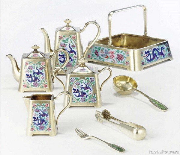 Редкий серебряный позолоченный чайно-кофейный сервиз в восточном стиле с изображением драконов, украшенный выемчатой эмалью, длина 9,5 см, Хлебников, Москва, 1886-1887 гг.