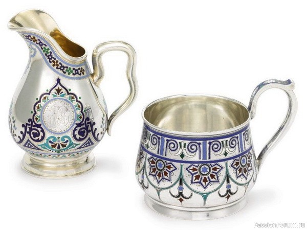 Серебряный подстаканник и сливочник, украшенные выемчатой эмалью, длина 10,5 см, Хлебников, Москва