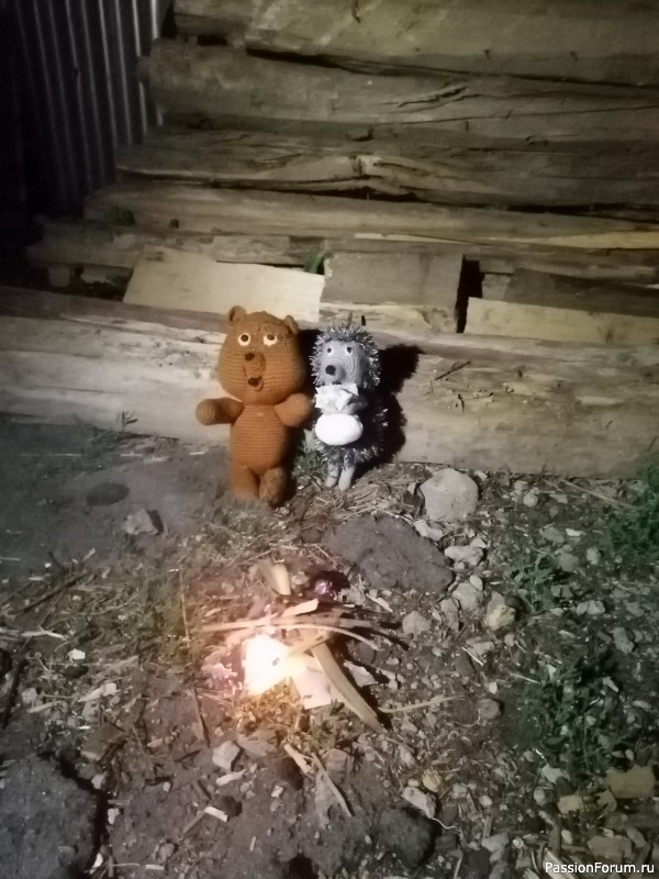 Славная парочка! У мишки на лбу брови такие суровые (или я что-то не поняла)? Очень забавные. И у костерочка в сумерках им очень уютно! вышли звезды считать!