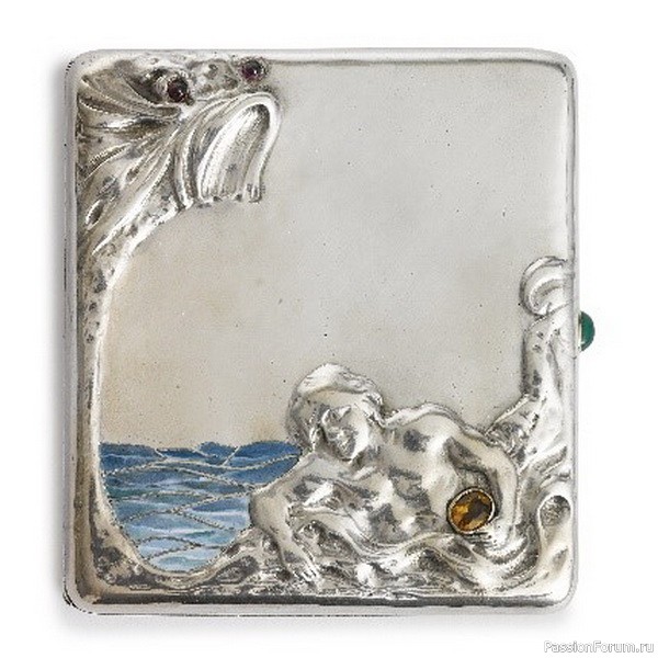 Серебряный портсигар с изображением пловца, спасающегося от морского чудица, украшенный чеканкой, живописной эмалью и драгоценными камнями, длина 10 см, мастер Егор Черятов, Москва, около 1900 г.