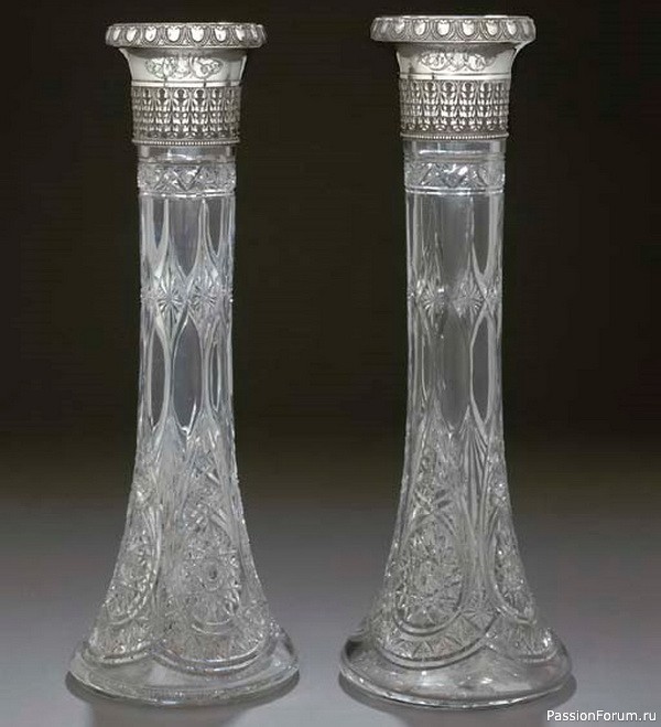 Парные хрустальные вазы в серебряной оправе, высота 49,7 см, мастер Егор Черятов, Москва, 1908-1917 гг.