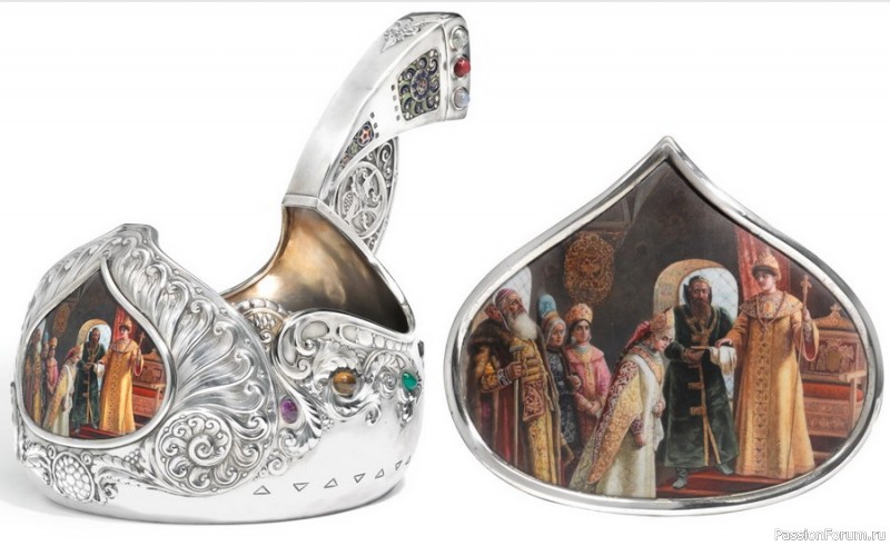 Серебряный ковш в стиле модерн, украшенный чеканкой и живописной эмалью на сюжет картины К. Маковского «Выбор невесты» (1886 г.), длина 41 см, мастер Егор Черятов, Москва, 1908-1917 гг.
