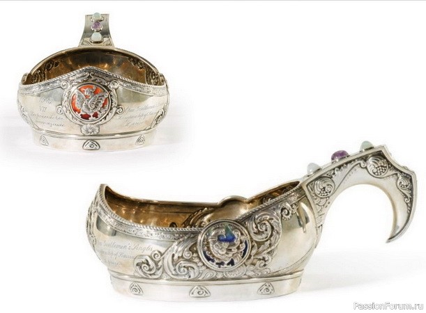 Большой серебряный ковш в панславянском стиле, украшенный чеканкой и эмалевыми медальонами с изображением стилизованных птиц, длина 27 см, мастер Егор Черятов для фирмы «Немиров-Колодкин», Москва, 1913 г.