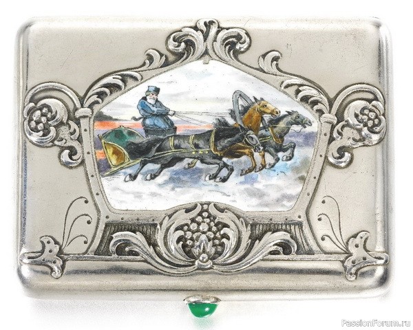 Серебряный портсигар, украшенный чеканкой и живописной эмалью, длина 11,5 см, мастер Егор Черятов, Москва, 1899-1908 гг.