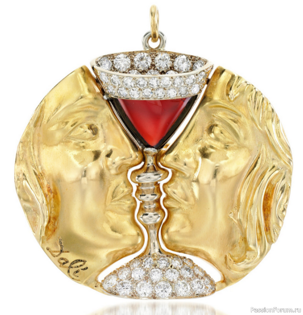 Золотая брошь «Тристан и Изольда» с гранатом и бриллиантами, выполненная Alemany & Ertman по дизайну Сальвадора Дали, около 1950 г.