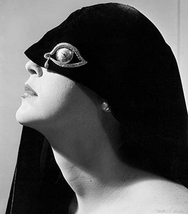 «Часы-глаз» в бархатной маске. Это фото сделано к парижской выставке «Драгоценностями Дали» 1950 года. Как писала пресса, в этой коллекции «Верховный жрец сюрреализма обратился к трехмерному искусству».