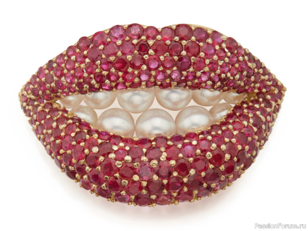 Золотая брошь «Ruby Lips» с рубинами и жемчугом, выполненная Хенриком Кастоном по дизайну Сальвадора Дали, около 1950 г.