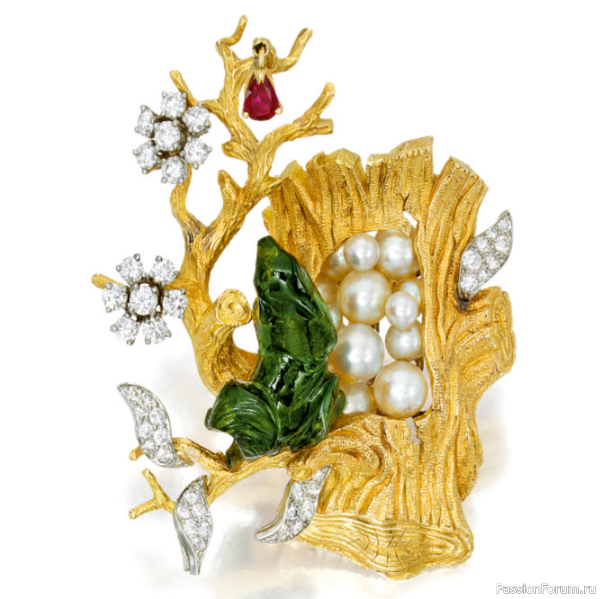 Золотая брошь с изображением белки из резного турмалина, сидящей на стволе дерева, украшенного жемчугом, с грушевидным рубином на ветвях и бриллиантовыми цветами, выполненная Alemany & Ertman по дизайну Сальвадора Дали, около 1950 г.