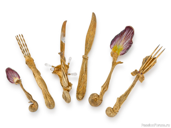 Четырехзубая вилка с ручкой в виде рыбы с сапфировыми глазами, вилка с тремя зубцами в виде слона с рубиновыми глазами, нож-улитка с четырьмя подвесками из горного хрусталя, нож в виде листа, маленькая ложка для артишока и большая ложка для артишока с полихромной эмалью.