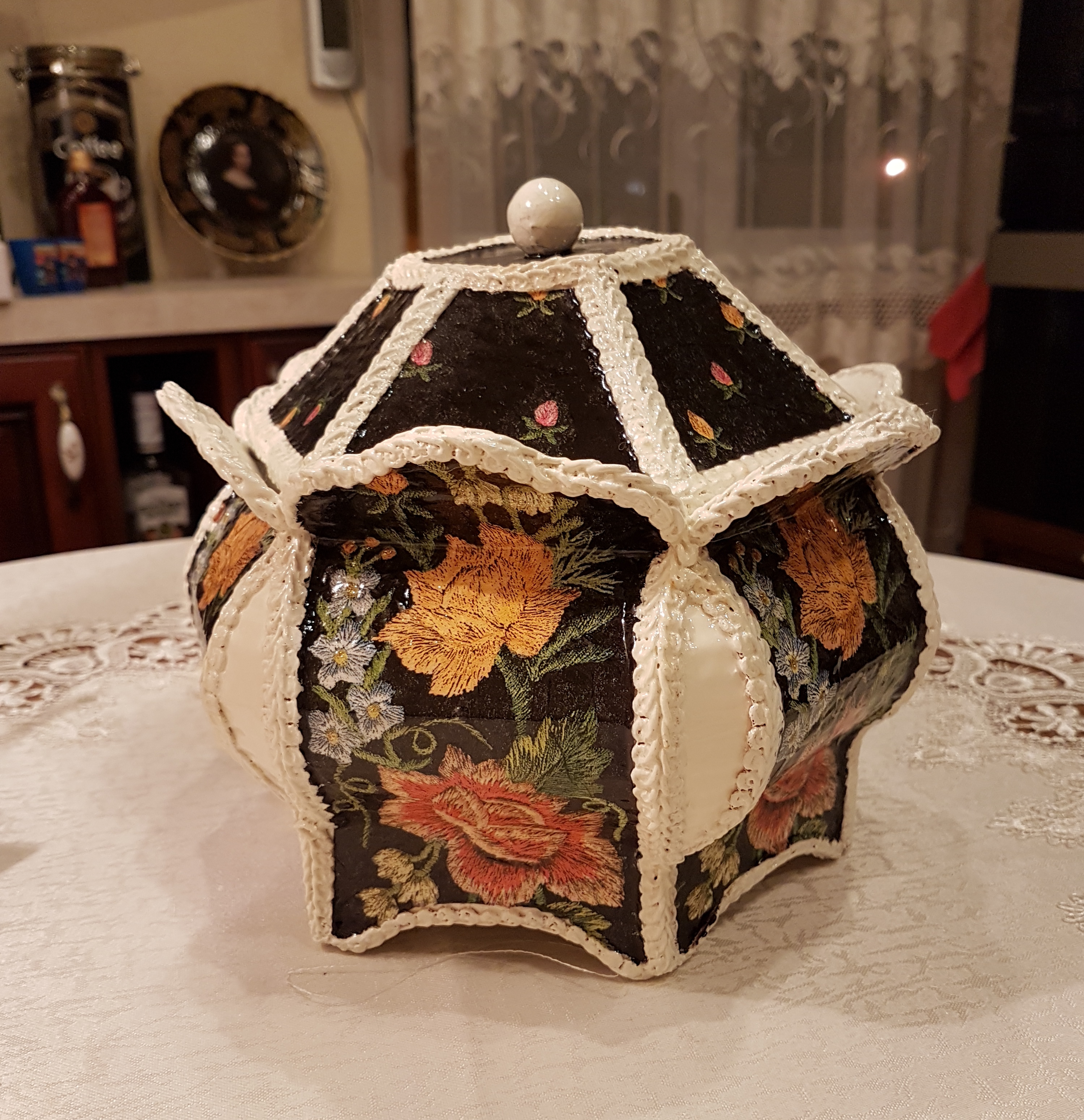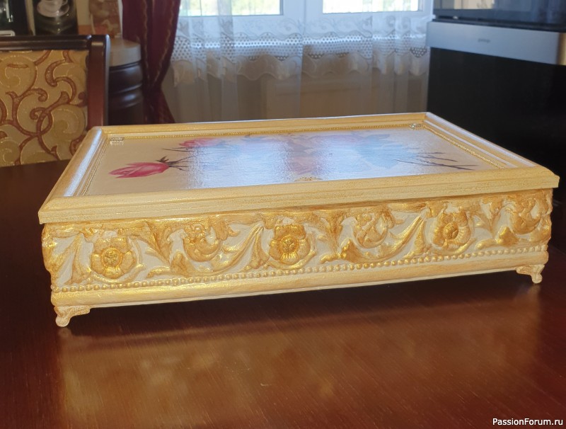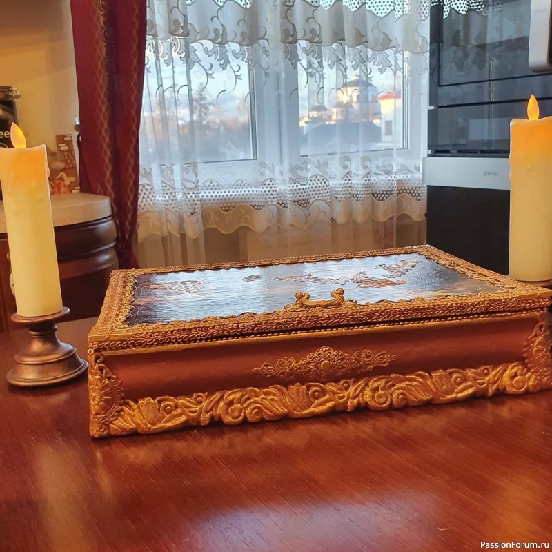Шкатулки роскошные! очень красивые. Про то, как крышка крепится тоже хотела спросить, но уже есть такой вопрос. Но у меня ещё вопрос — потолочный плинтус из чего? Если тот, что, например, использовала при ремонте, то ведь он хрупкий. Это на потолке его никто не трогает. А шкатулка — если ею пользоваться, то такой плинтус быстро подведёт. Или это деревянный? Если так, то тогда, конечно, вопросов нет!
