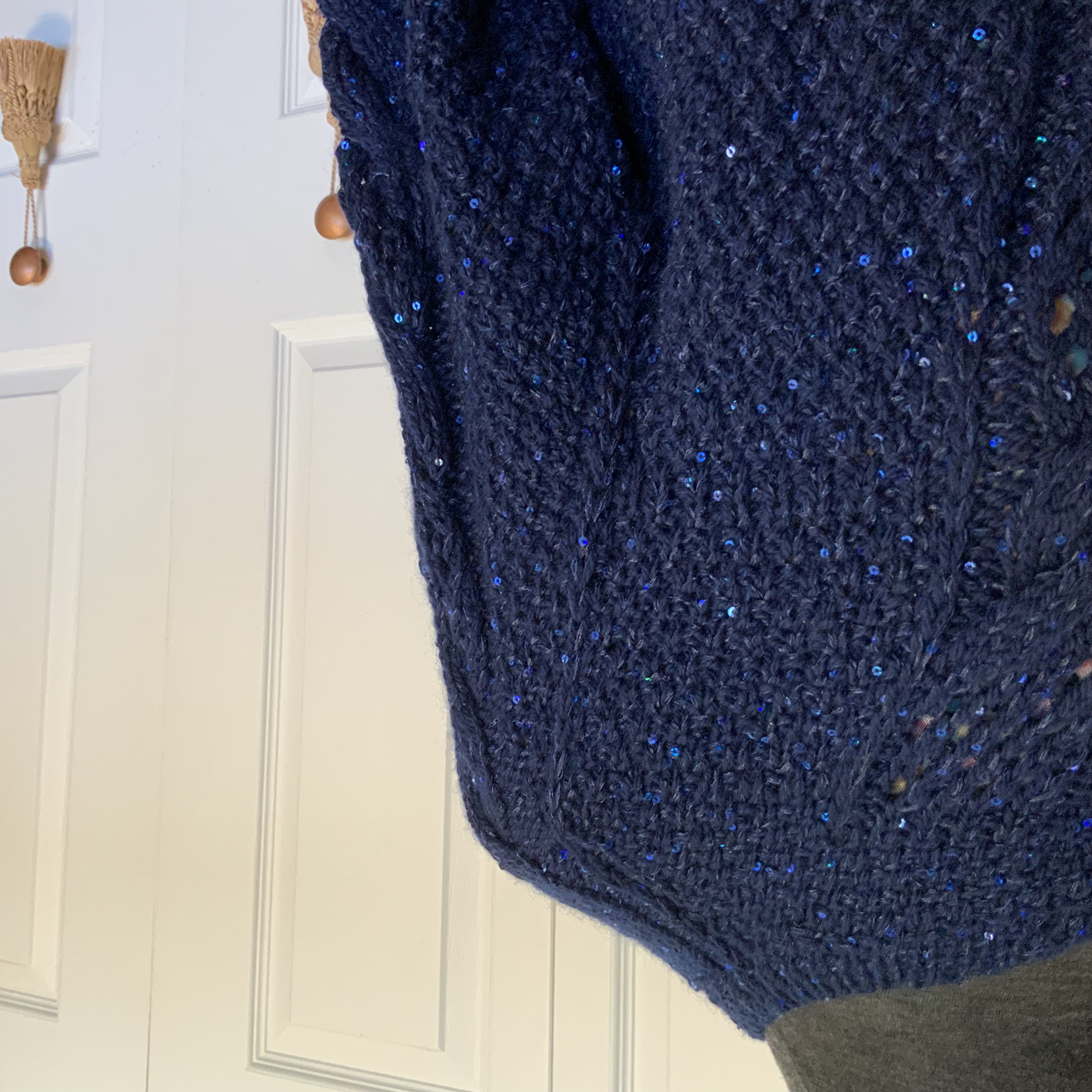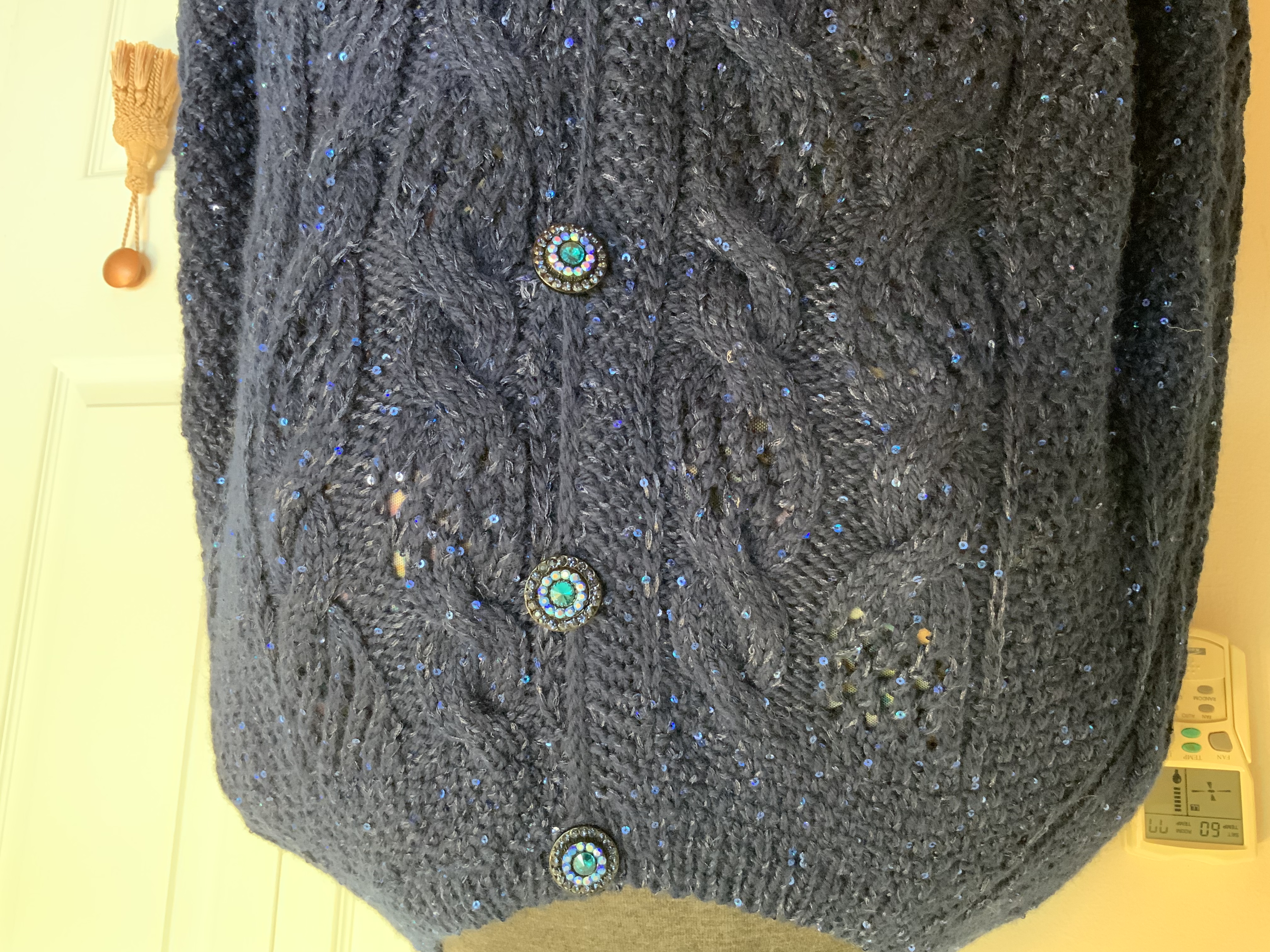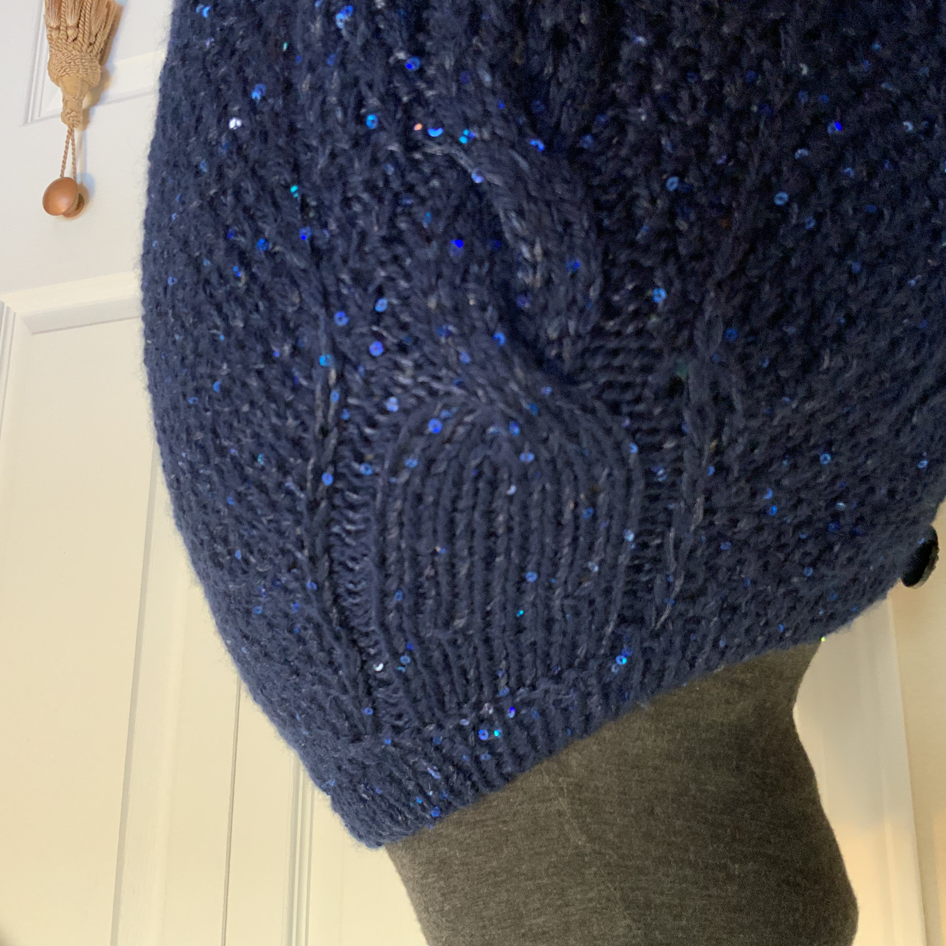 Начала подготовку к приходу зимы. Кардиган связан спицами из турецкой 100% шерсти и шёлковой нитки с палетками. Обе нитки тёмно синего цвета.