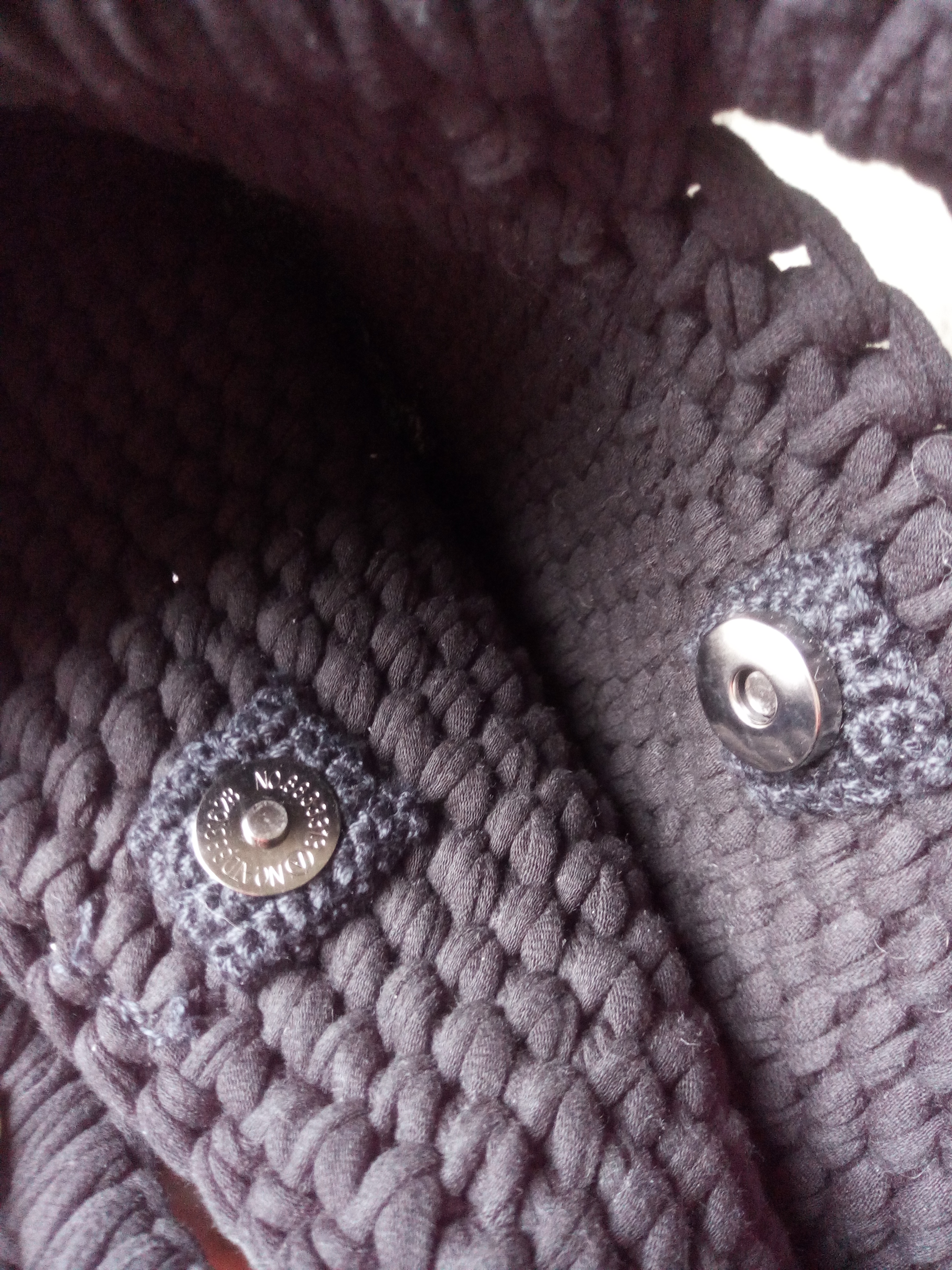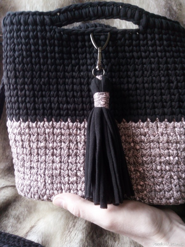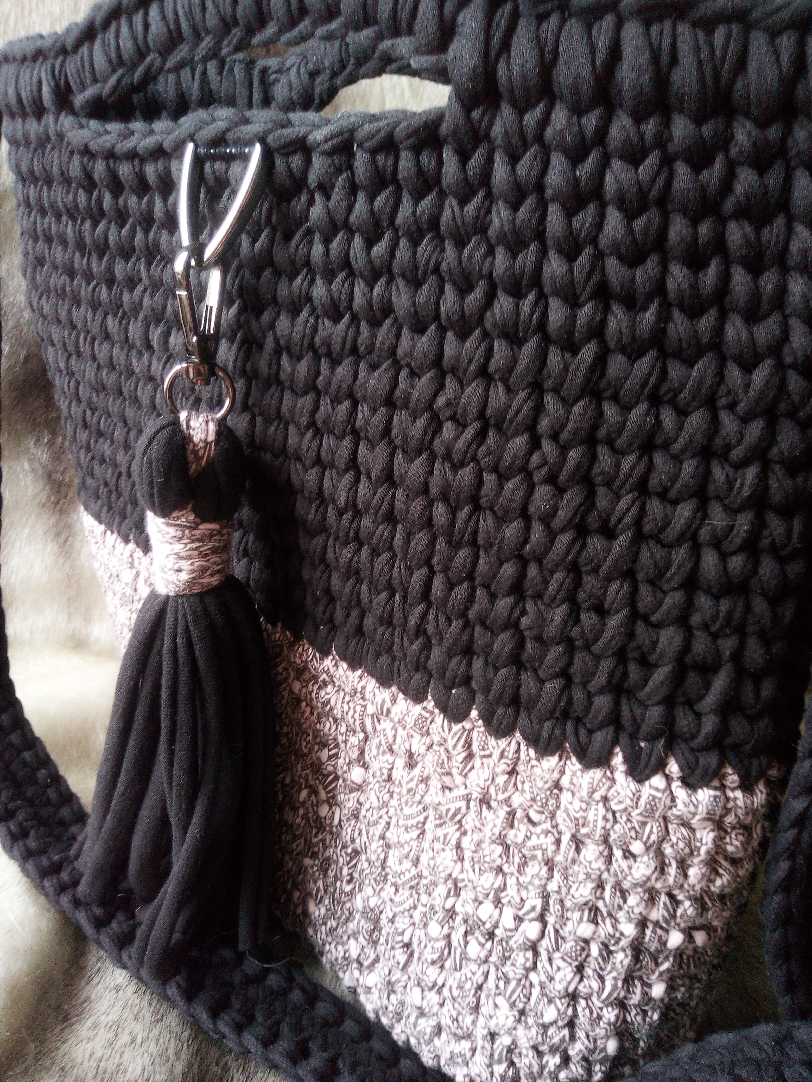 Сумка связана из пряжи двух цветов. Размер 25 на 25 см, ширина 9 см. Довольна вместительна, крепкая, прекрасно держит форму. Ремень длиной 110 см, отстёгивается. Украшение-кисточка тоже на карабинчике. Внутри-кнопка. Для кнопки вязала из хлопка пластинки, чтобы не повредились стенки сумки. Фурнитура- металлическая, цвет-чёрный никель, очень благородный приглушённый оттенок. Фото не передаёт настоящего цвета пряжи, цвет более насыщенный. Цветная серая пряжа имеет белые крапинки, создаётся впечатление пришитого бисера.