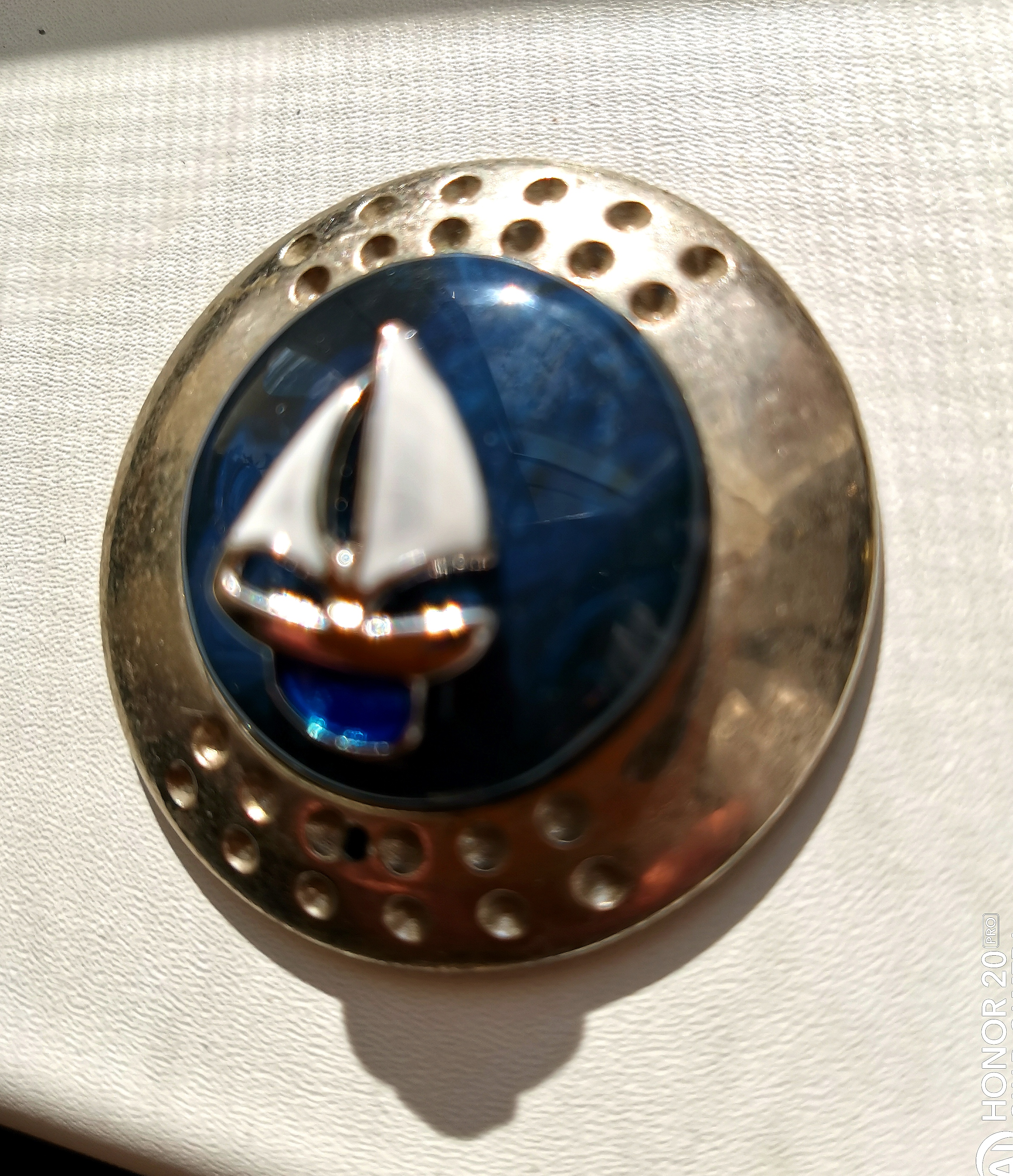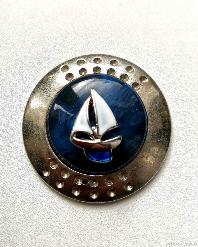 кулон на основе кольца из нержавеющего металла со встроенным кабошоном тенгезита и фигуркой яхты покрытой эмалью.