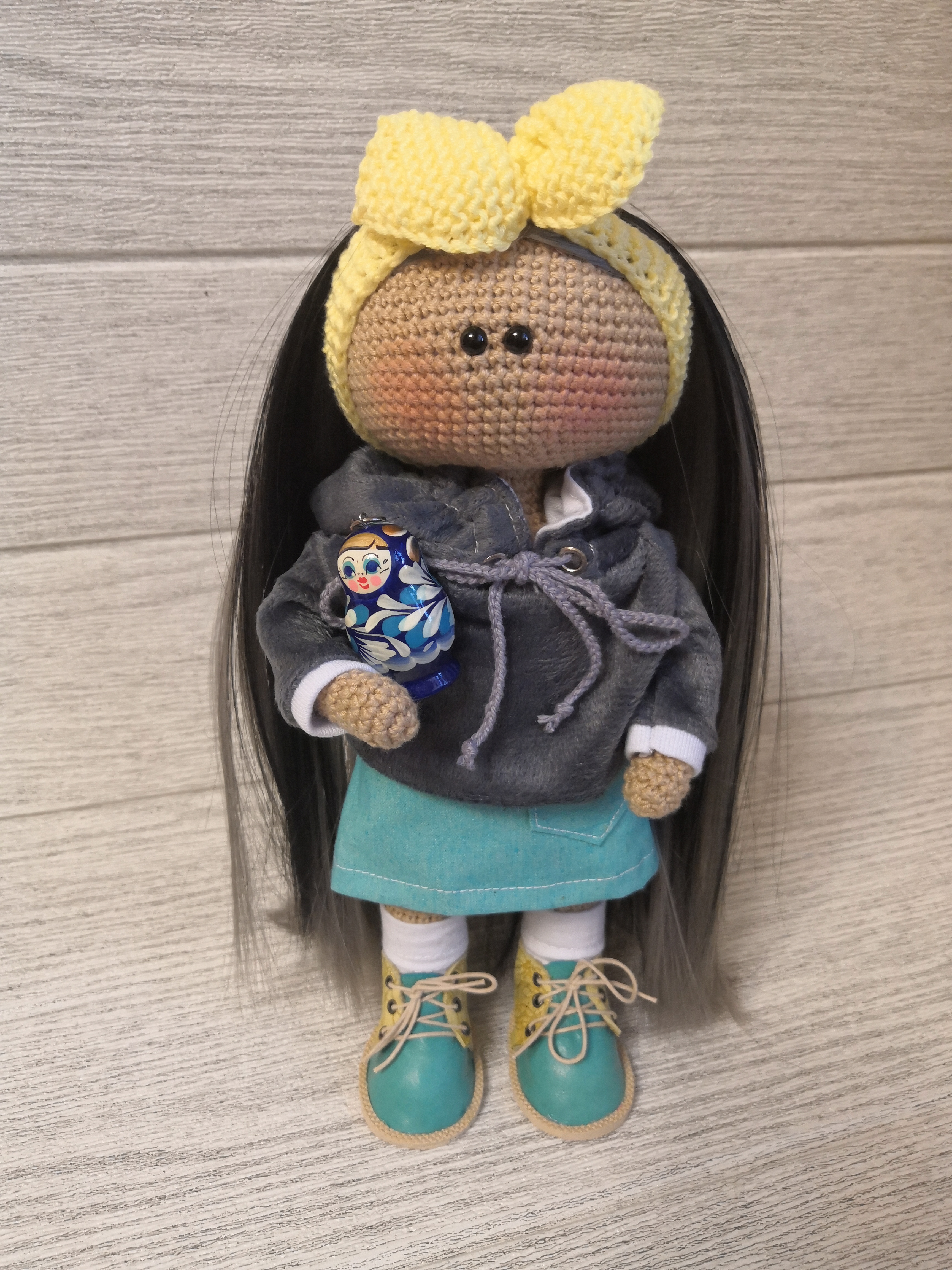 Куколка Мила - 28 см. Все материалы используюемые в работе натуральные. Обувь из натуральной кожи. Одежда снимается. Ручки гнутся. Стоит за счёт обуви.