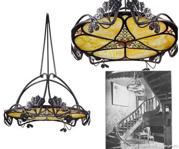 Потолочный светильник Monnaie du Pape (лунник) с виллы Majorelle, созданный Луи Мажорелем и Жаком Грубером (1870-1936), диаметр 98 см, кованое железо, тонированное опалесцирующее стекло, 1901 г. В интерьере виллы доминировала тема цветов. Мотив monnaie du pape присутствует в дизайне входной двери, а также в двух окнах на лестнице, которые также выполнены из стекла Жака Грубера.