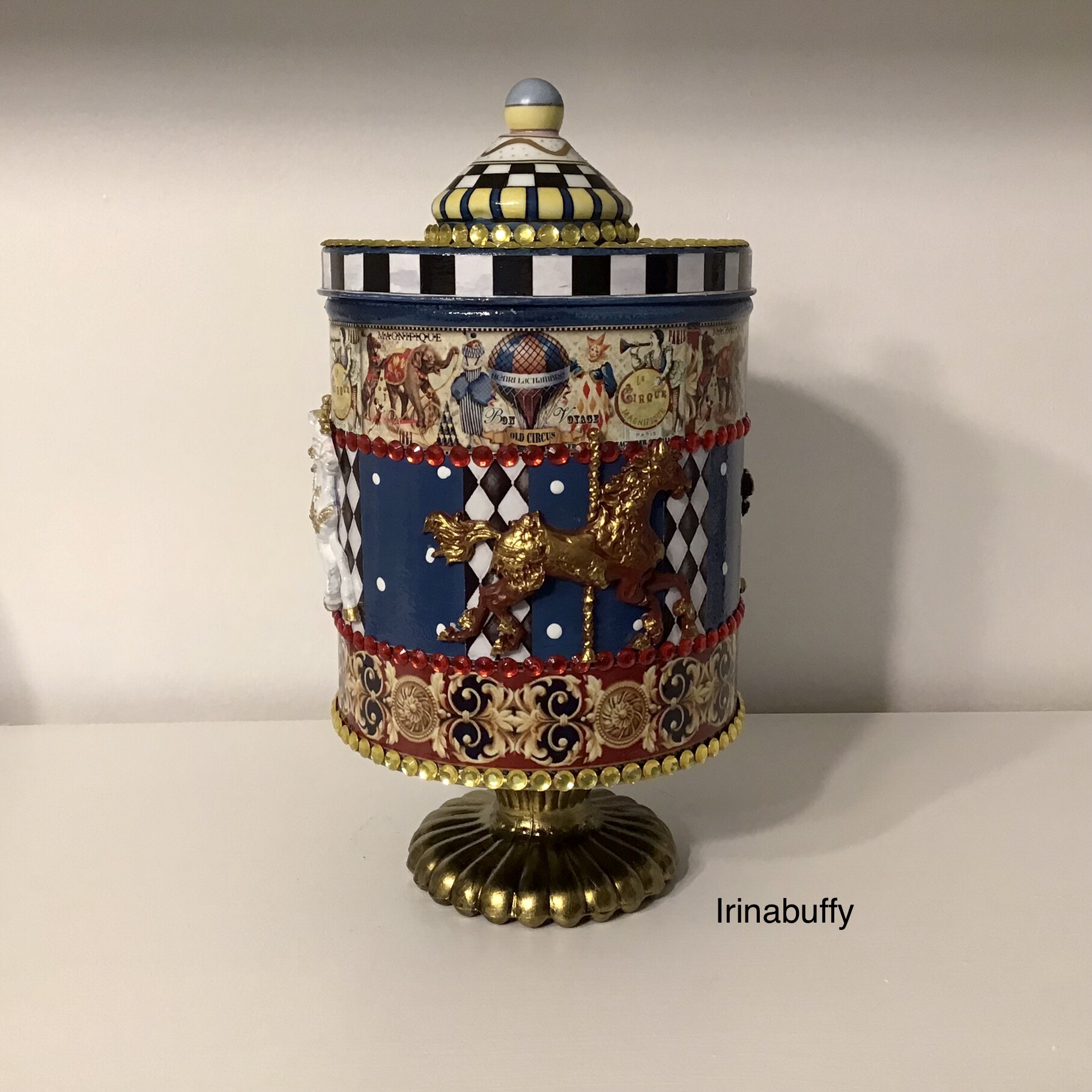 В любом возрасте карусель всегда вызывает позитивные, радостные и задорные чувства! Вот и твоя карусель Ирина такая яркая, красивая и весёлая получилась- просто прелесть! У тебя замечательный вкус подбирать цвета и украшалки- все гармонично и радует глаз. Отлично разукрасила белую лошадку, очень понравилась крышка и по ней вопрос- как ты так красиво разрисовала ее?? Это распечатка или сама красила? Ножка шикарная- так здорово подошла!!! У тебя самая красивая карусель из всех, которые я видела до сих пор!
