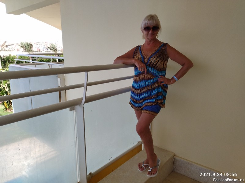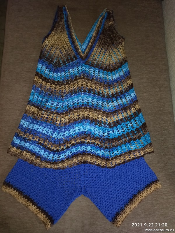 Как ранее и обещала, представляю вам готовый комплект. Шорты довязала и в жарких странах обновила. Но скажу честно, всё равно что-то не так получилось. Нет полного удовлетворения. Я же изначально задумывала как сарафан. И видно в голове отложилась именно эта идея. Скорее всего буду перевязывать в сарафан. Несмотря на то, что с виду костюмчик смотрится утепленным,на самом деле он очень воздушный и легкий. Вязала из той же пряжи Alize DIVA (в мотке 100 г 350м).Буду рада услышать ваше мнение