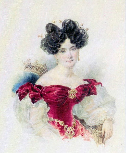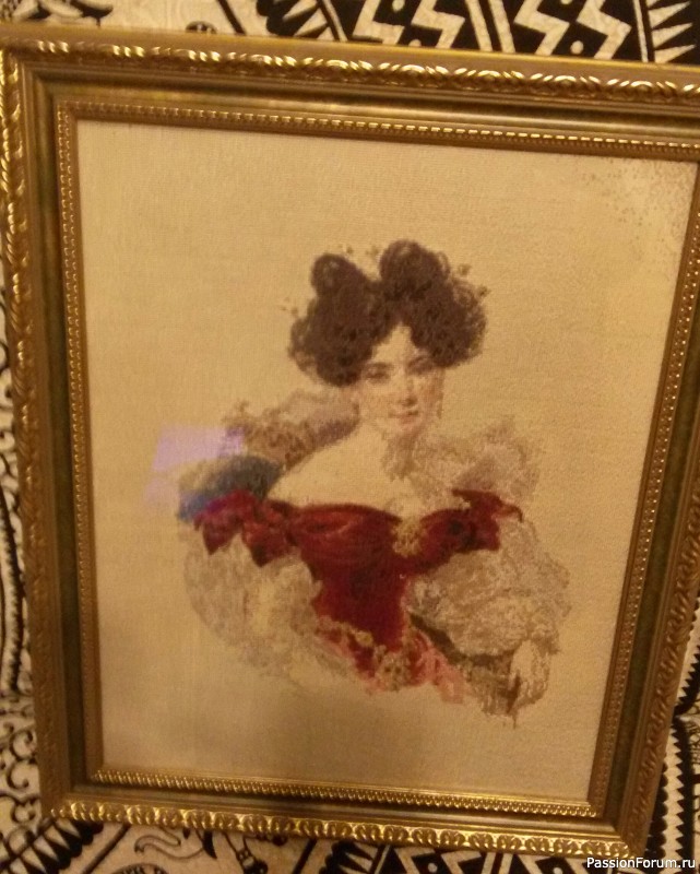 Долгие годы я работала в Рождественской Строгановской церкви в Нижнем Новгороде, когда она была филиалом музея. Это красивейший памятник петровского времени, построенный по заказу купца солепромышленника Григория Дмитриевича Строганова. Род Строгановых один из известнейших у нас в стране. И я никогда не была к нему равнодушной. Поэтому, когда на просторах интернета мне попала схема портрета одной из Строгановых, я конечно же взялась за работу. Одновременно с вышивкой пришлось поискать и саму героиню. Оказалось это графиня Наталья Викторовна Строганова, урожденная княжна Кочубей, (1800–1854) — дочь графа В.П.Кочубея, председателя Государственного Совета и Комитета министров, с 1820 года жена барона Александра Григорьевича Строганова (1795—1891),знакомая А.С.Пушкина. *По свидетельству М. А. Корфа, она была «первым предметом любви Пушкина», ранним увлечением юного поэта. Знакомство и встречи Пушкина с Кочубей относятся к первым годам пребывания его в Лицее, когда она проживала с родителями в Царском Селе.