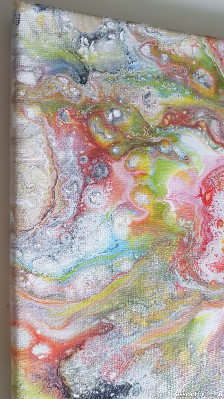 Эти работы выполнила способом заливки из стакана, смешиваю краски ( в отдельных стаканчиках ) с клеем ПВА + вода и потом соединяю их в один большой стакан. Соотношение 1 :3. Купила ПВА в строительном отделе магазина- очень густой, разбавила водой и разлила по бутылкам.Пробовала и из двух стаканов лить одновременно, и на вот такие приспособления.Это донышки от пластиковых бутылочек. По мокрым краскам прокатывала шарик стеклянный, красивый след остаётся! Резиновый тоже импользую.