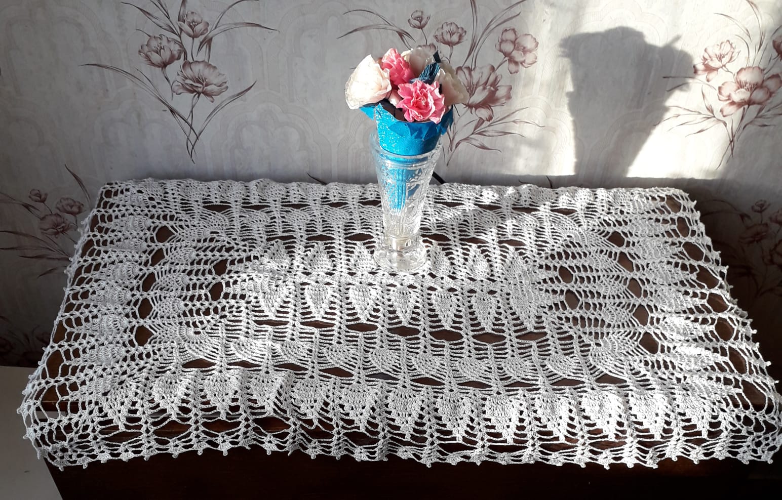 Впервые сделала пробный вариант прямоугольной мини-скатерти по схеме вязания большой салфетки. Использовала ниточки ИРИС, крючок 2. Весом получилось около 140 гр. и размером 60 х 90 см, немного не дотянув до нужной длины в 100 см. для журнального столика. Поэтому следующим этапом моей задумки послужит вязание такого же варианта скатерти, но с небольшим увеличением в размере из белой пехорки Ажурной.