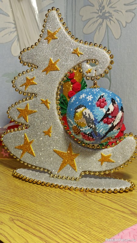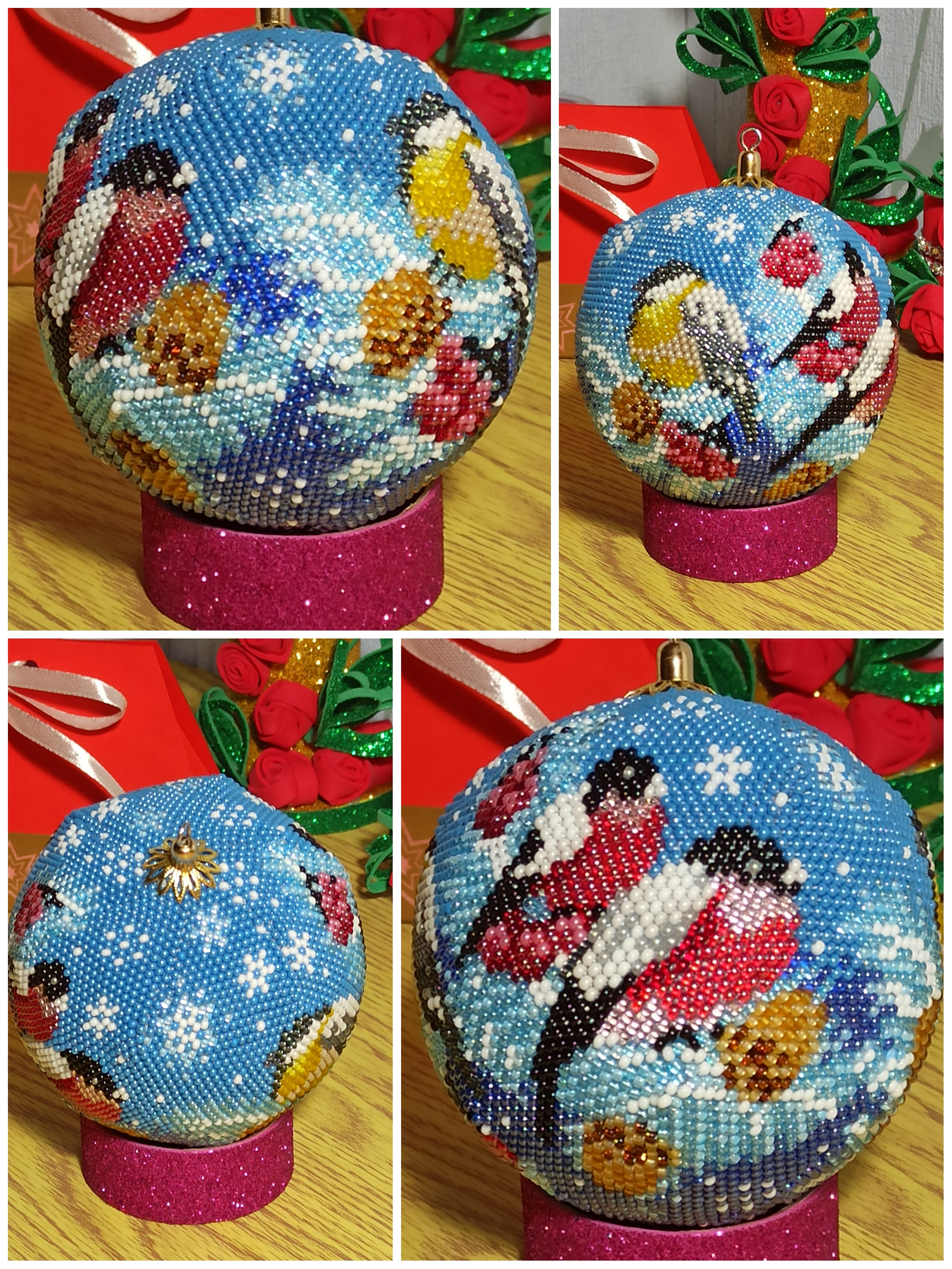 Вот опять пролетел год. И на пороге обратно праздник. В это время ,у меня включается режим приготовления к НГ. И у меня навязались шарики с бисера. Размер 6 и 8 см. Снегири и синички уже уселись на веточках ёлочек.