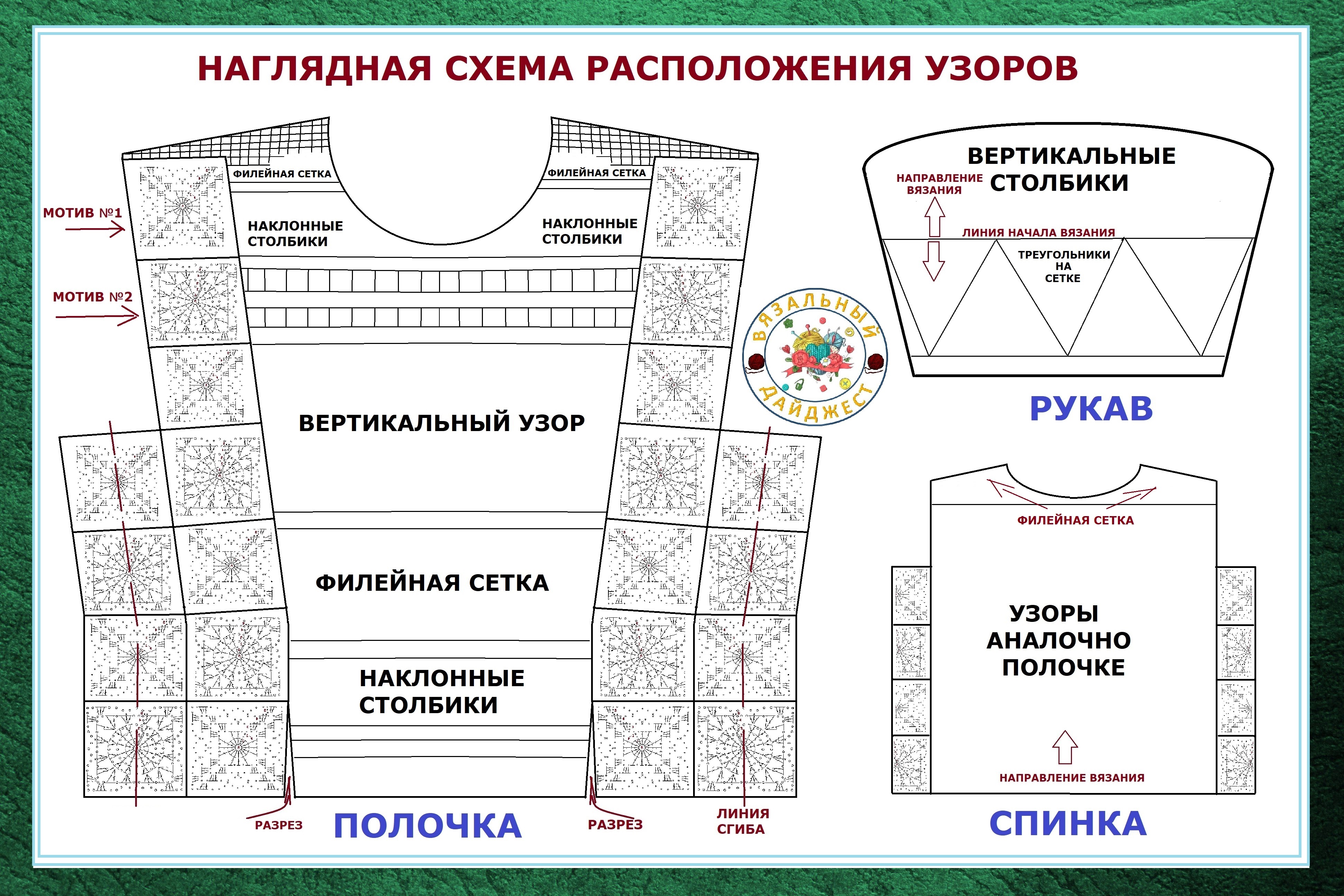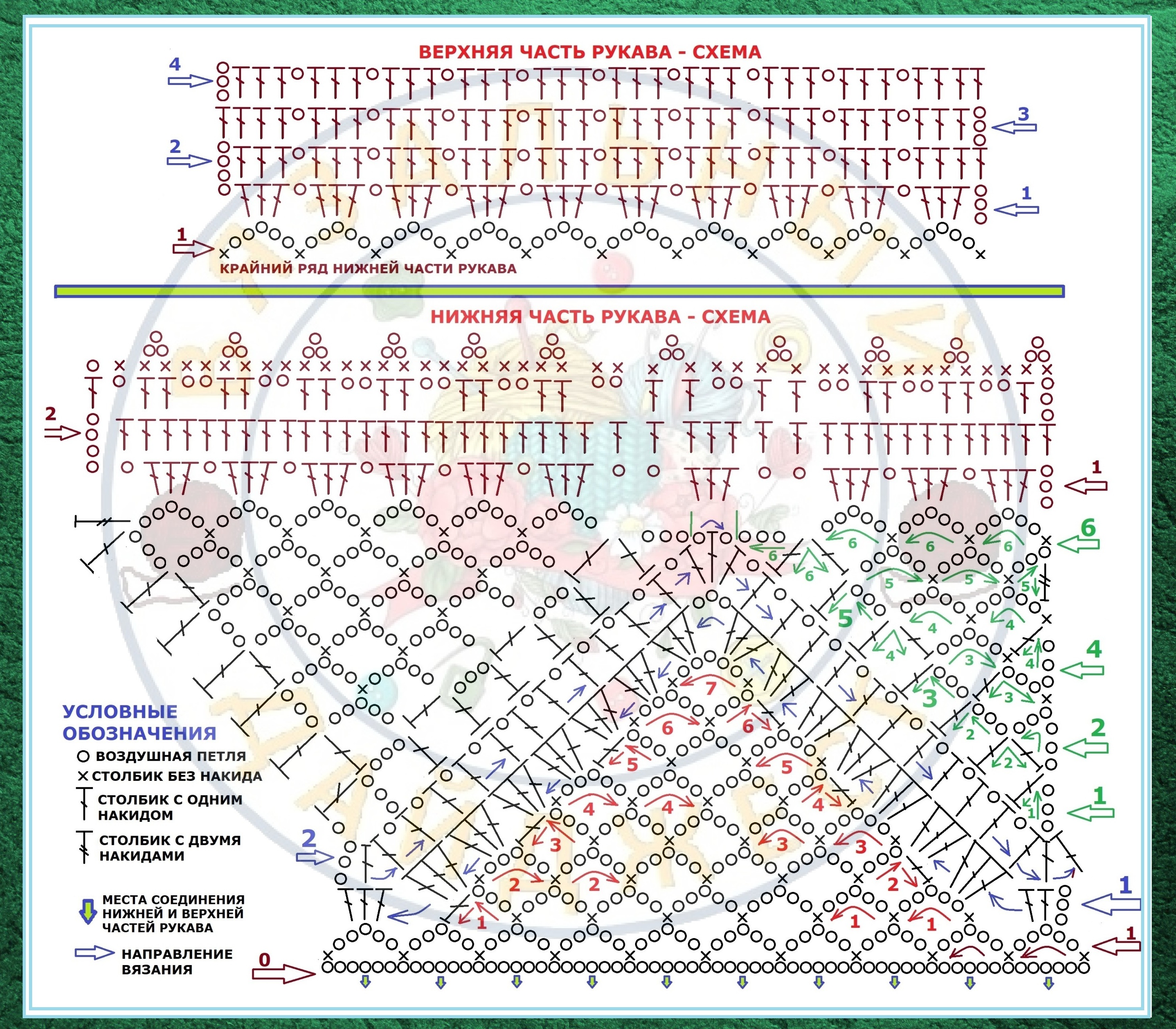 - Направление вязания рукавов от центра вниз – узор «треугольники на сетке» + обвязка с «пико» и вверх – узор «вертикальные столбики», которые образуют окат.