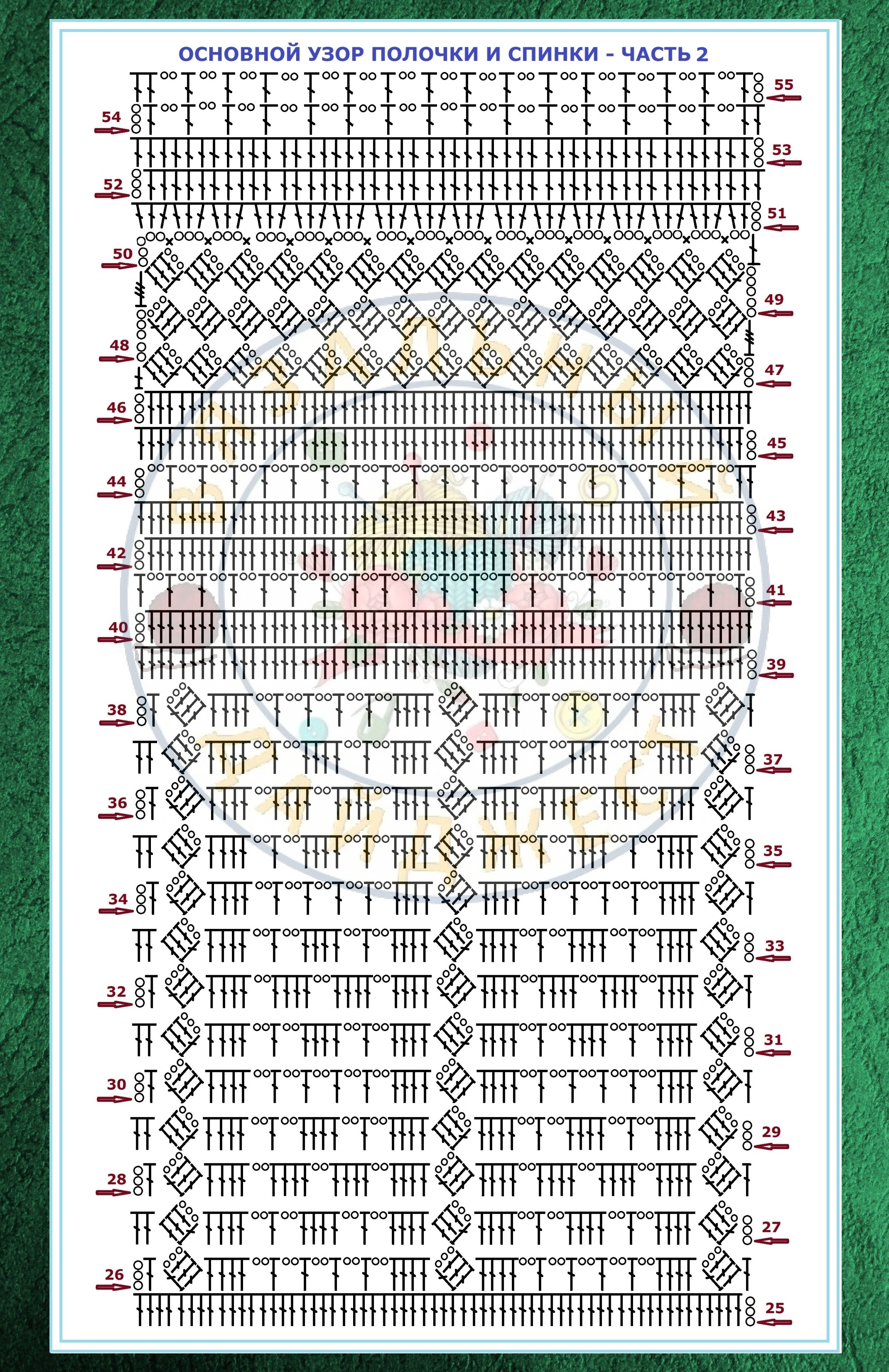 - Очерёдность вязания полочки и спинки: основное полотно полочки с прибавками; основное полотно спинки; вставки из мотивов; соединение основного полотна со вставками из мотивов.