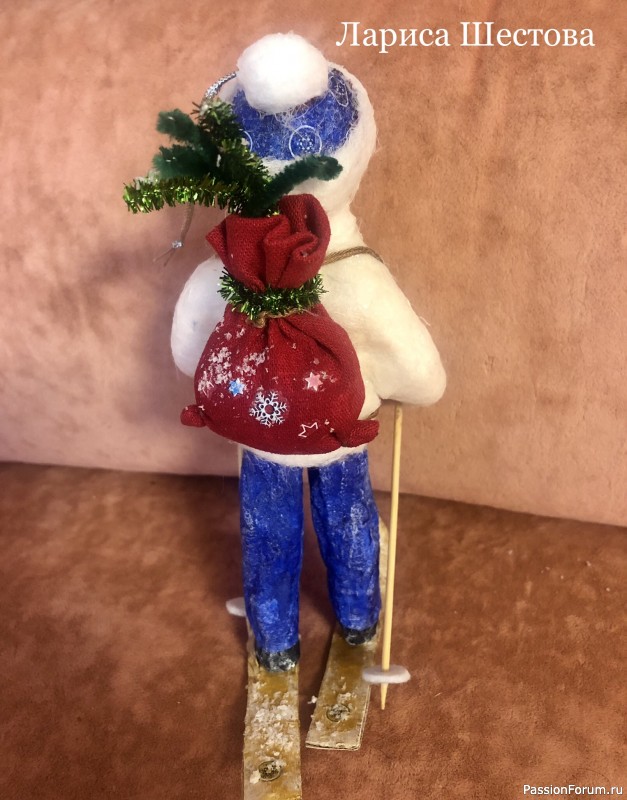 Авторская ватная игрушка-лыжник с подарками , 17см