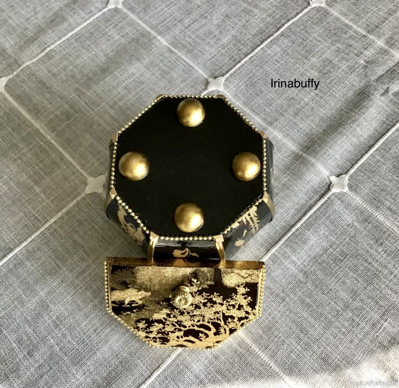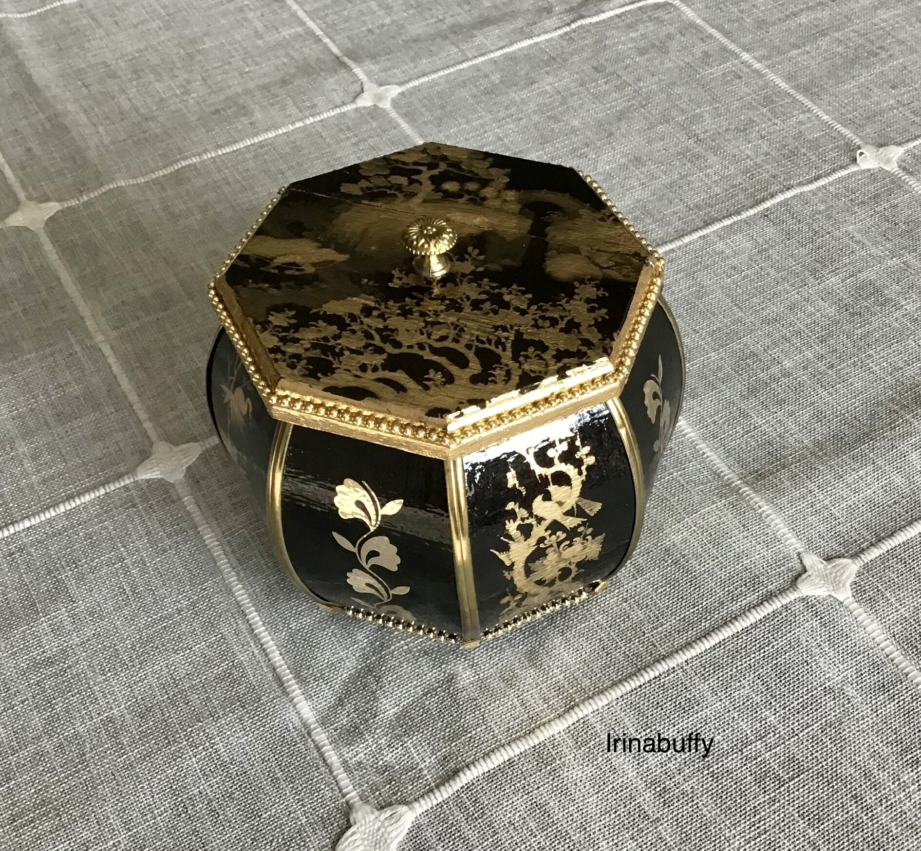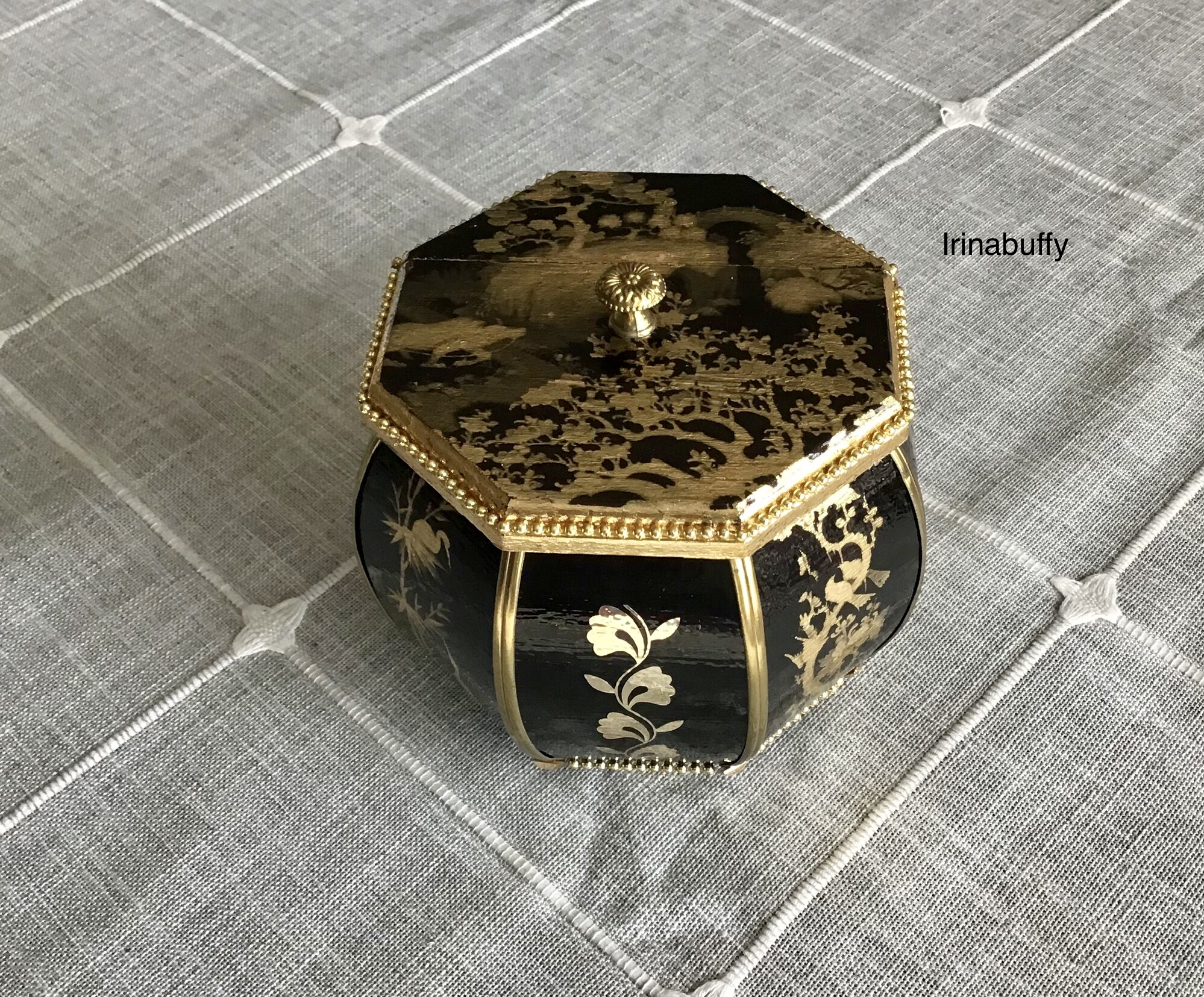 Надежда, спасибо огромное! Шинуазри не очень простой стиль.Главное в нем создать золотой мотив на чёрном или красном фоне. Конкретно об этой шкатулке я пояснила под фото порядок работы.Требуется распечатка черно- белая с китайским мотивом, она вживляется на поверхность, покрытую листовой поталью.После удаления бумаги путём скатывания, просвечивает золото на местах, где был белый рисунок.Подкрашивается чёрной краской темный фон.Таким образом создаётся имитация росписи золотом на чёрном фоне.Далее лакировка и шкурение до гладкой лаковой поверхности.Сложно описать весь этот долгий процесс, лучше один раз увидеть.Если очень хочется научиться этому стилю, советую мастера Любовь Митрофанову.У неё есть очень доступный мастер- класс по этому стилю.Я училась у неё.Вживую я могла бы все показать, а описывать сложно, так как на любом этапе есть свои тонкости.