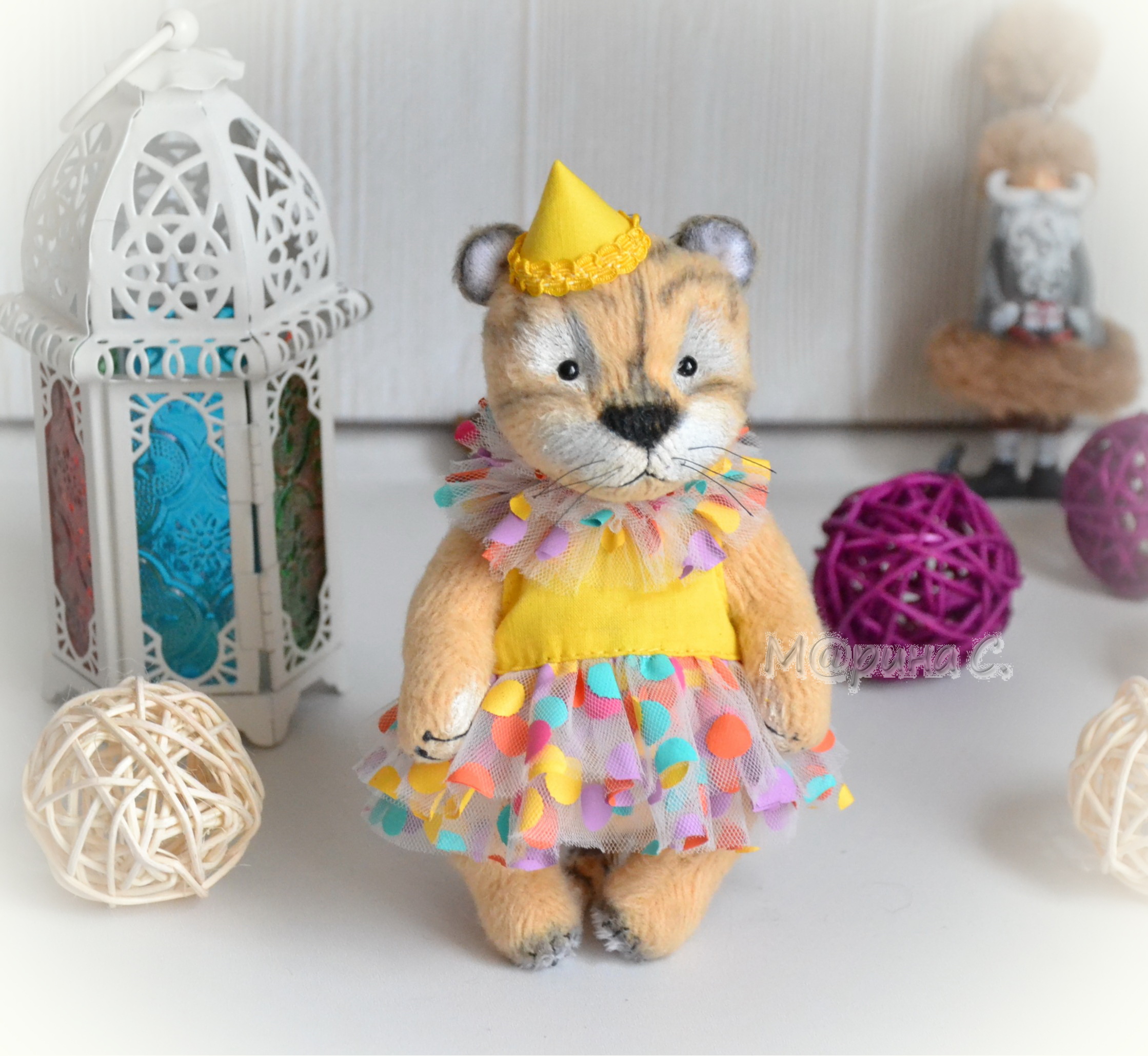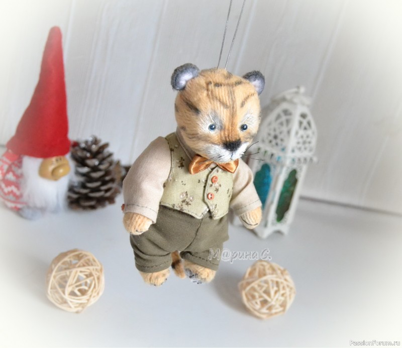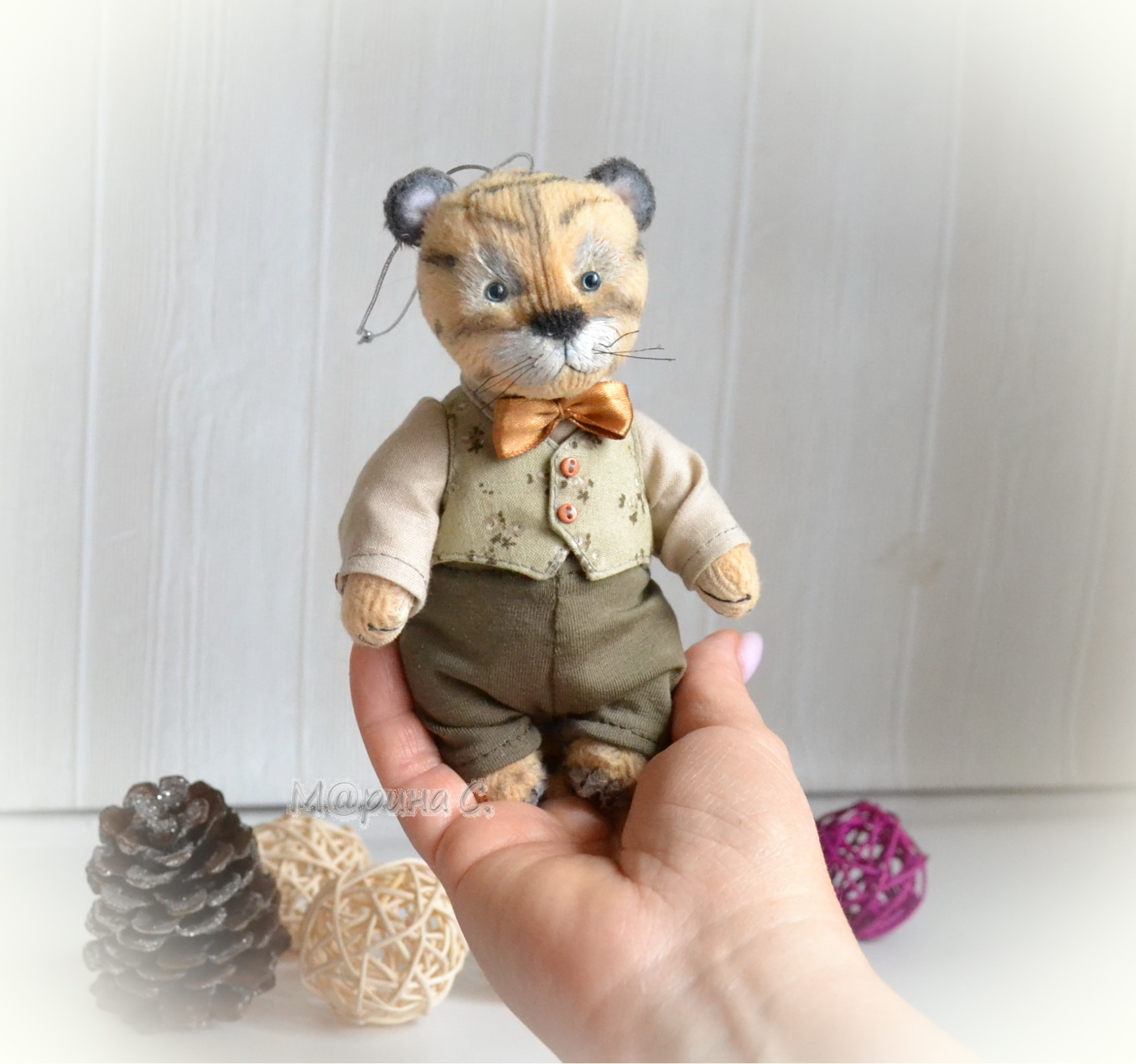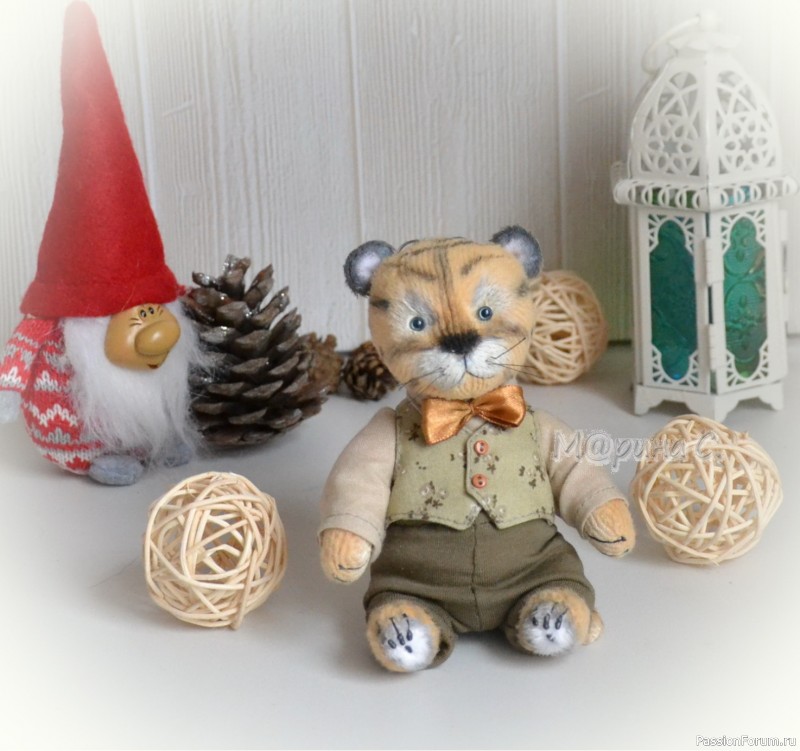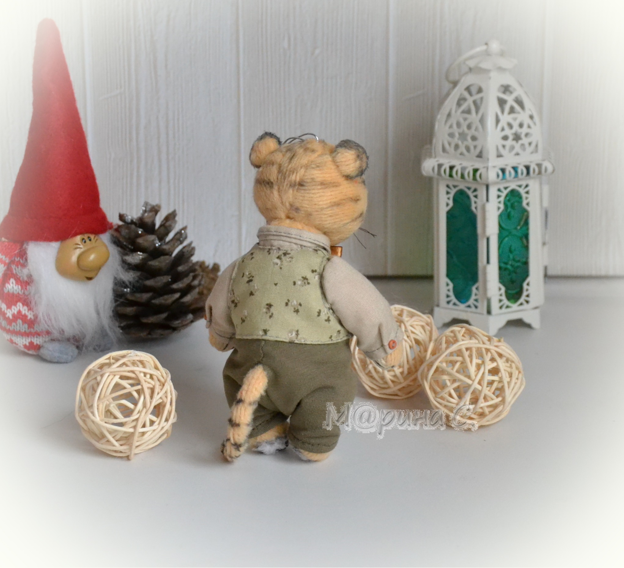 Купила плюшик, полоски нарисовала маслом, набила холлофайбером, приодела, сделала петельки. Вот что получилось. Ростом 14 см.