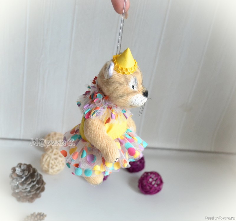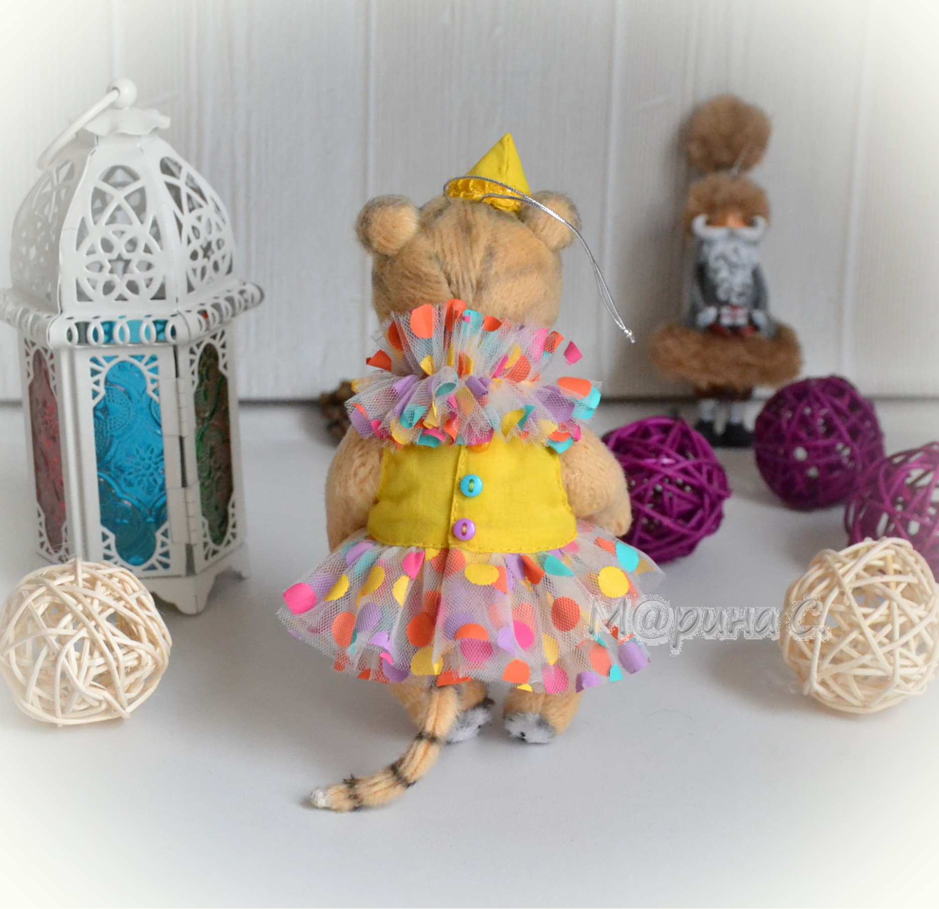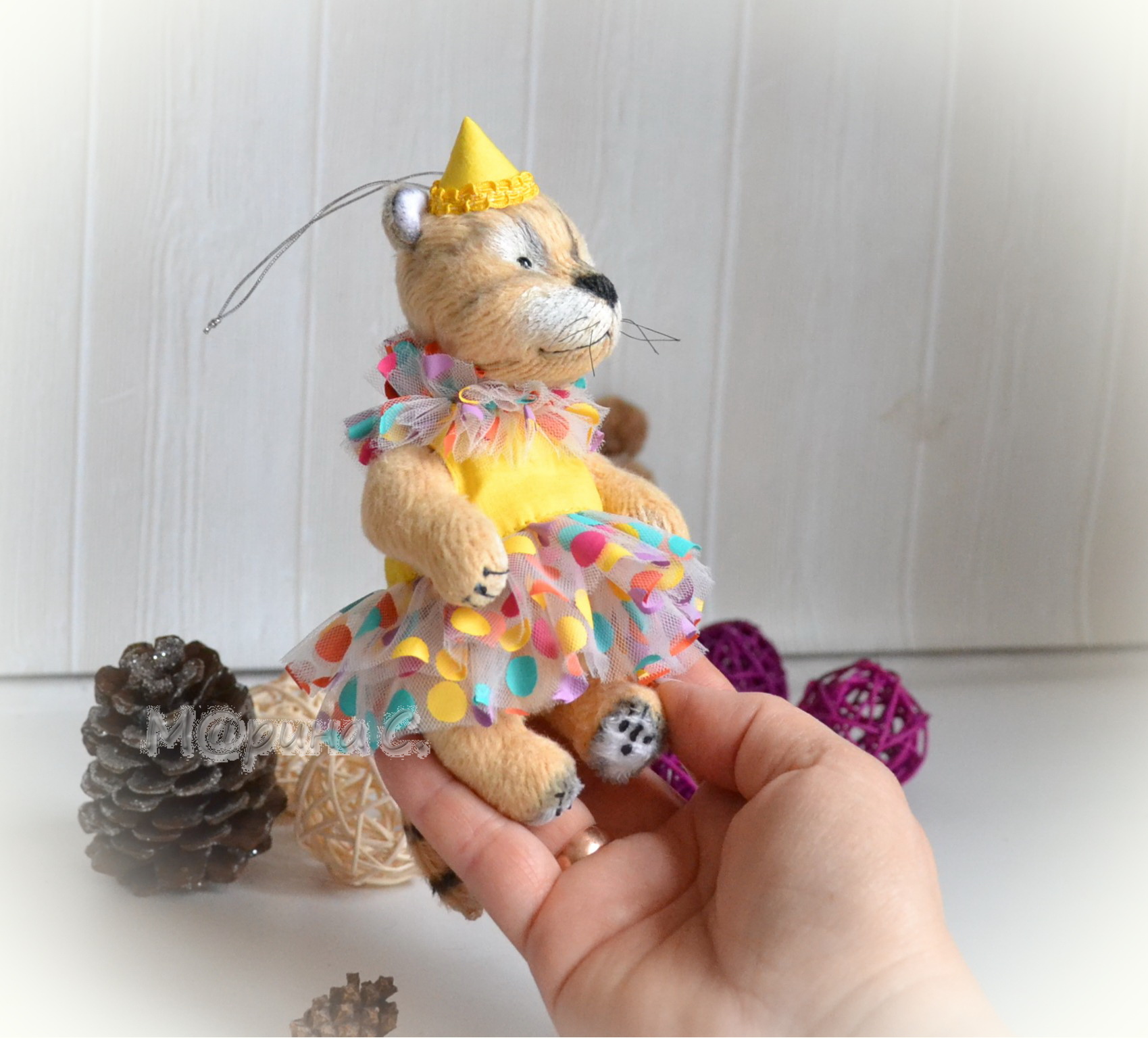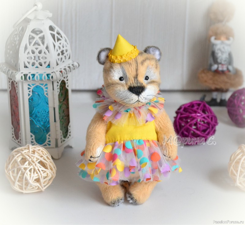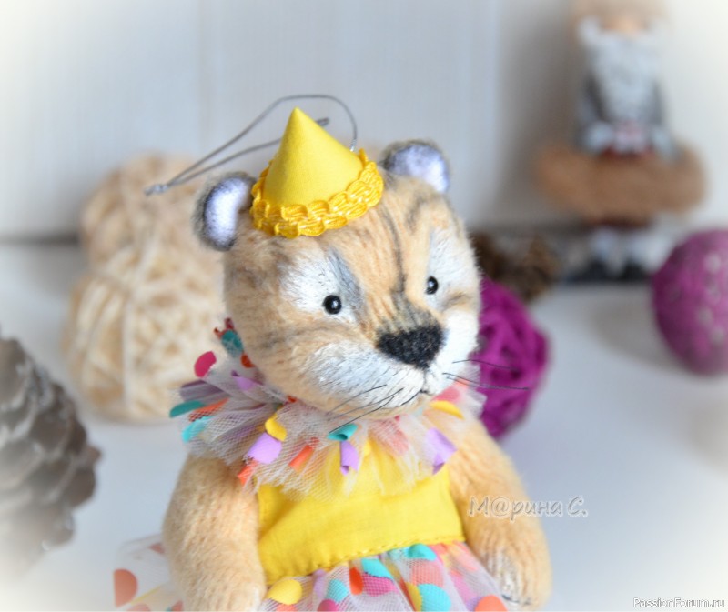 Купила плюшик, полоски нарисовала маслом, набила холлофайбером, приодела, сделала петельки. Вот что получилось. Ростом 14 см.