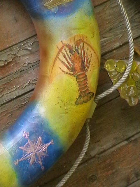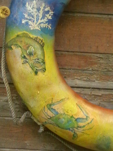 Также решила что-то сделать со старым спасательным кругом. Посмотрите, как получилось. В этом году круг висел возле дома, а на следующий сезон отнесу на пирс.