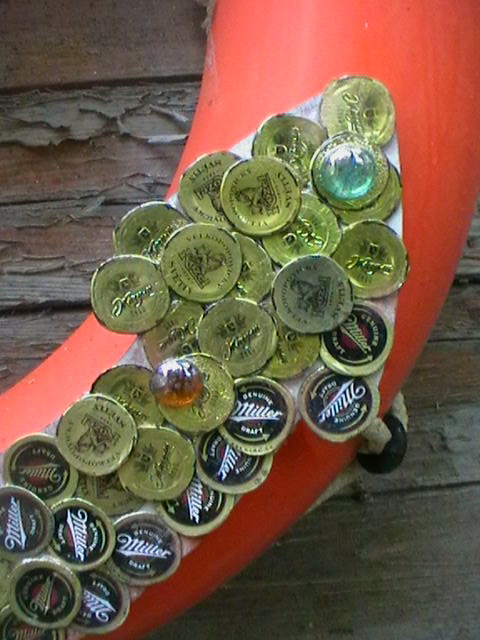 Периодически просматриваю завалы очень и не очень нужных вещей для творческих работ, что-то отдаю или выбрасываю, что-то пускаю в дело. Летом вытащила фанерный якорь и штурвал, которые очень давно подарил приятель. Повертела их так и сяк, вспомнила, как когда-то задекорировала из этой же серии фанерную русалку. По тому же принципу поступила и с этими предметами. Расплющила кувалдой (есть у меня такая небольшая и очень удобная) пивные пробки и обклеила заготовки. Интересно получилось или нет, судите сами. Но попытка утащить якорь была.