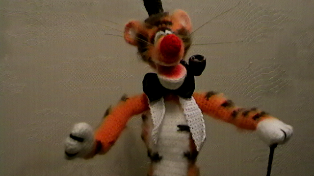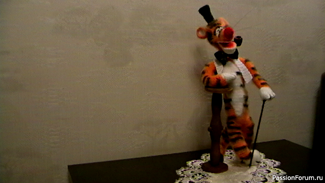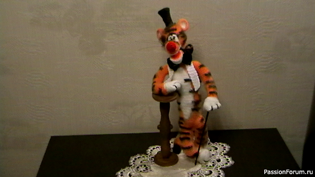 Рост тигрули 46 см. Связан из шерстяной пряжи. Вполне устойчив и с удовольствием меняет позы, благодаря проволочному каркасу.