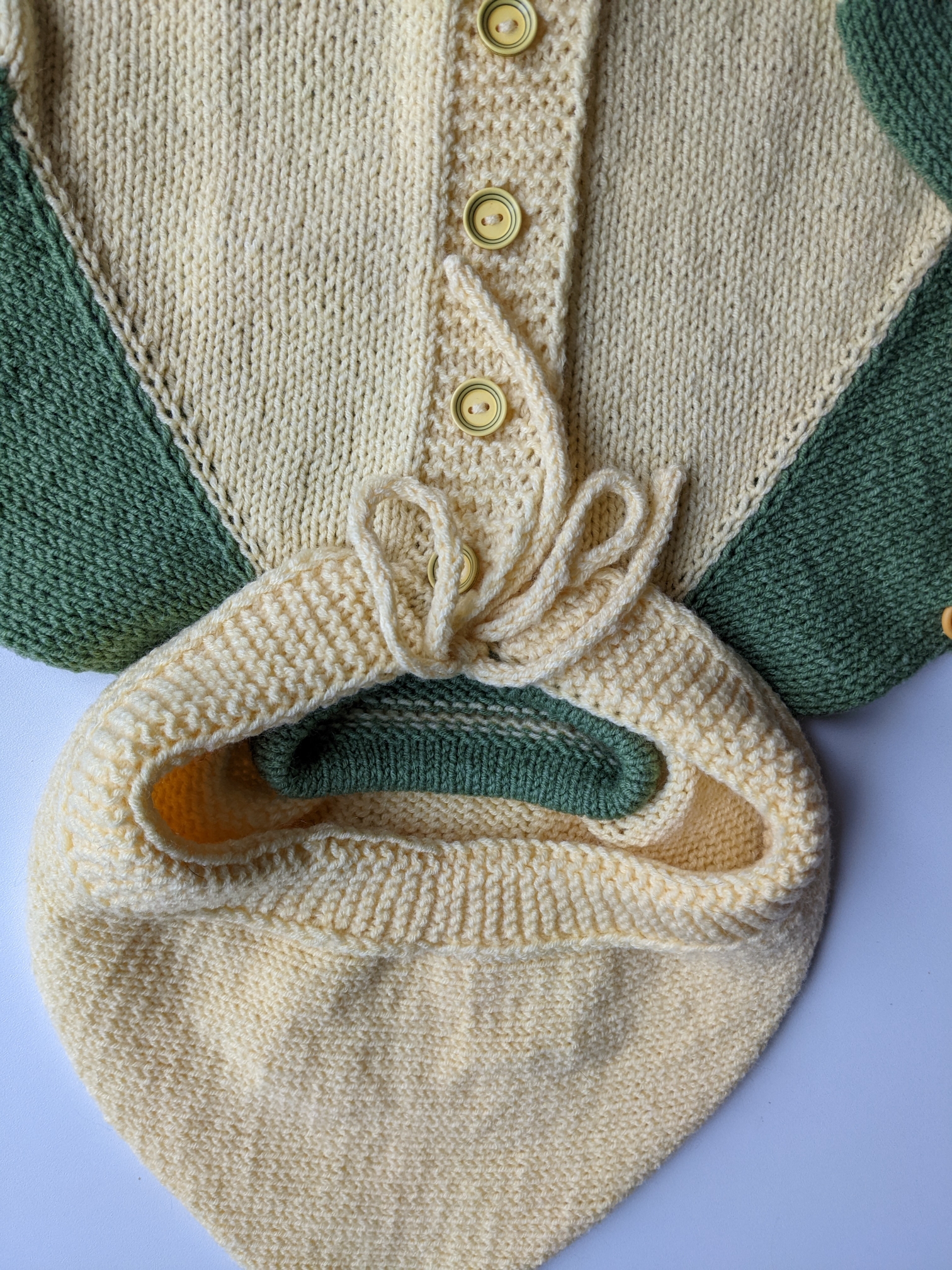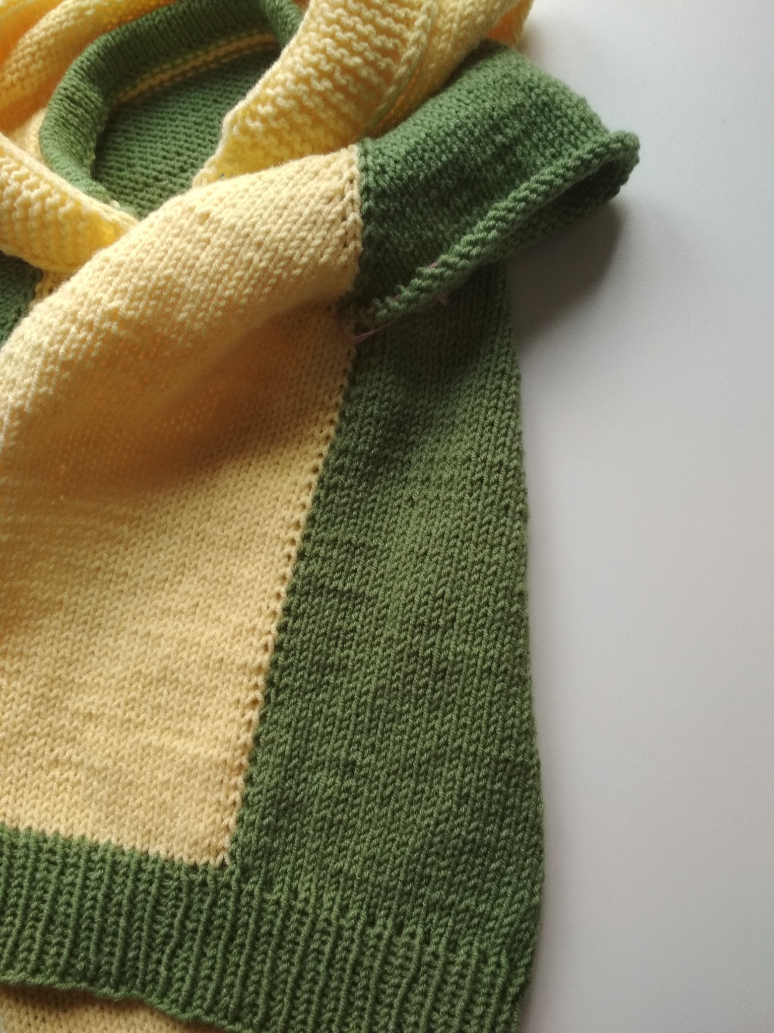 Пряжа Alize Lanacoton, колор 485 зелёный и 87 светлый лимон, 50г/160м. Состав: 26% шерсть, 26% хлопок, 49% акрил. Расход: 110гр. зеленого цвета и 80 гр. лимонного. Спицы 3,5мм и 3,0мм (для резинки).