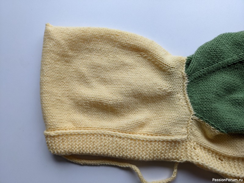 Начало вязания от капюшона. Набор петель идет по верхней центральной линии от лба до макушки. Двойной отворот платочной