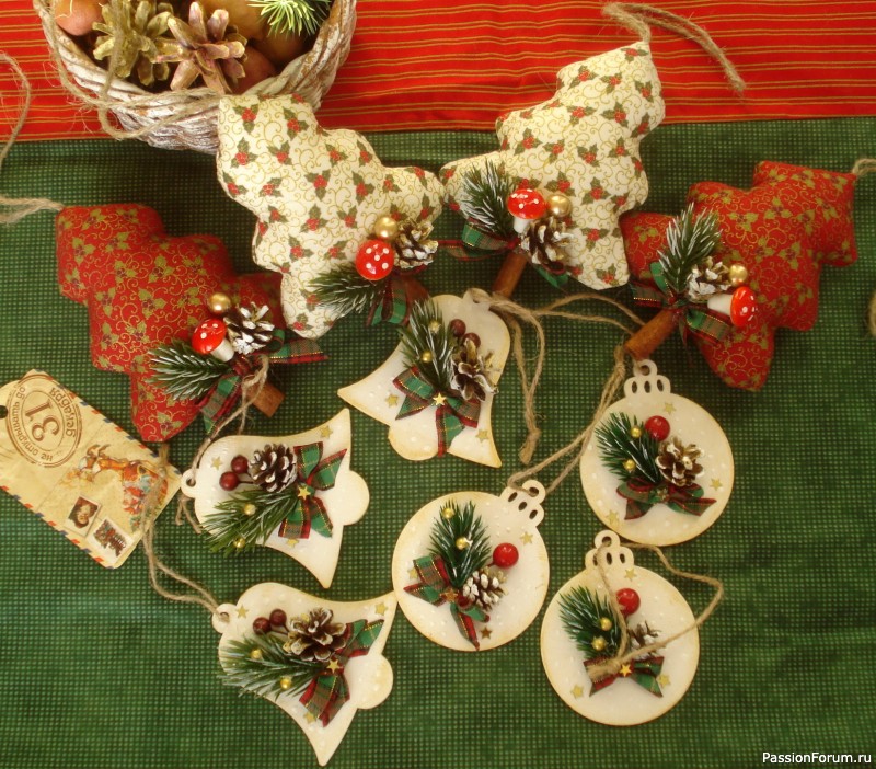 В яркий новогодний набор игрушек входят: четыре ёлочки( красивой расцветки хлопок, шишки, декоративные элементы, палочки корицы) + три колокольчика и три шарика(деревянные заготовки + декор).