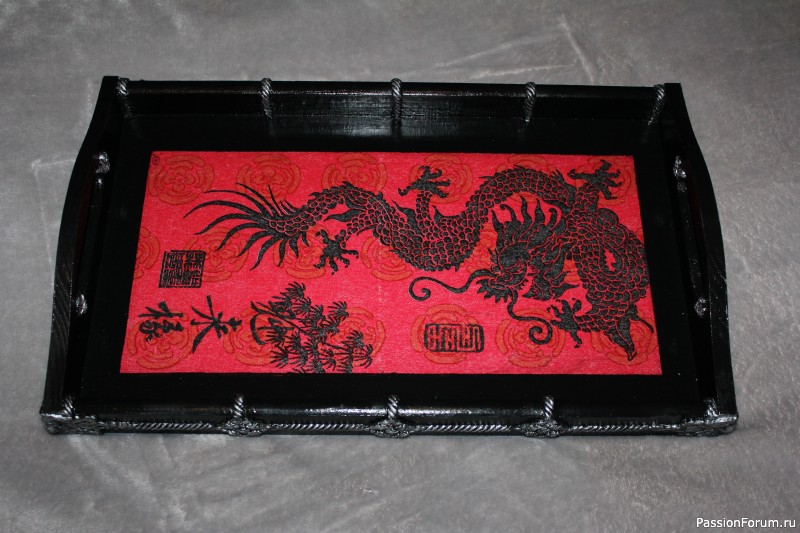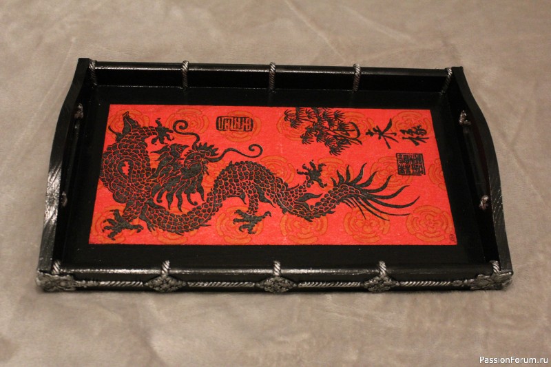 Для декупажа деревянного подноса использовала салфетку с драконом. Боковины украсила молдами из самотвердеющей глины. Дно буду заливать смолой, но не вытерпела- показала вам сейчас.