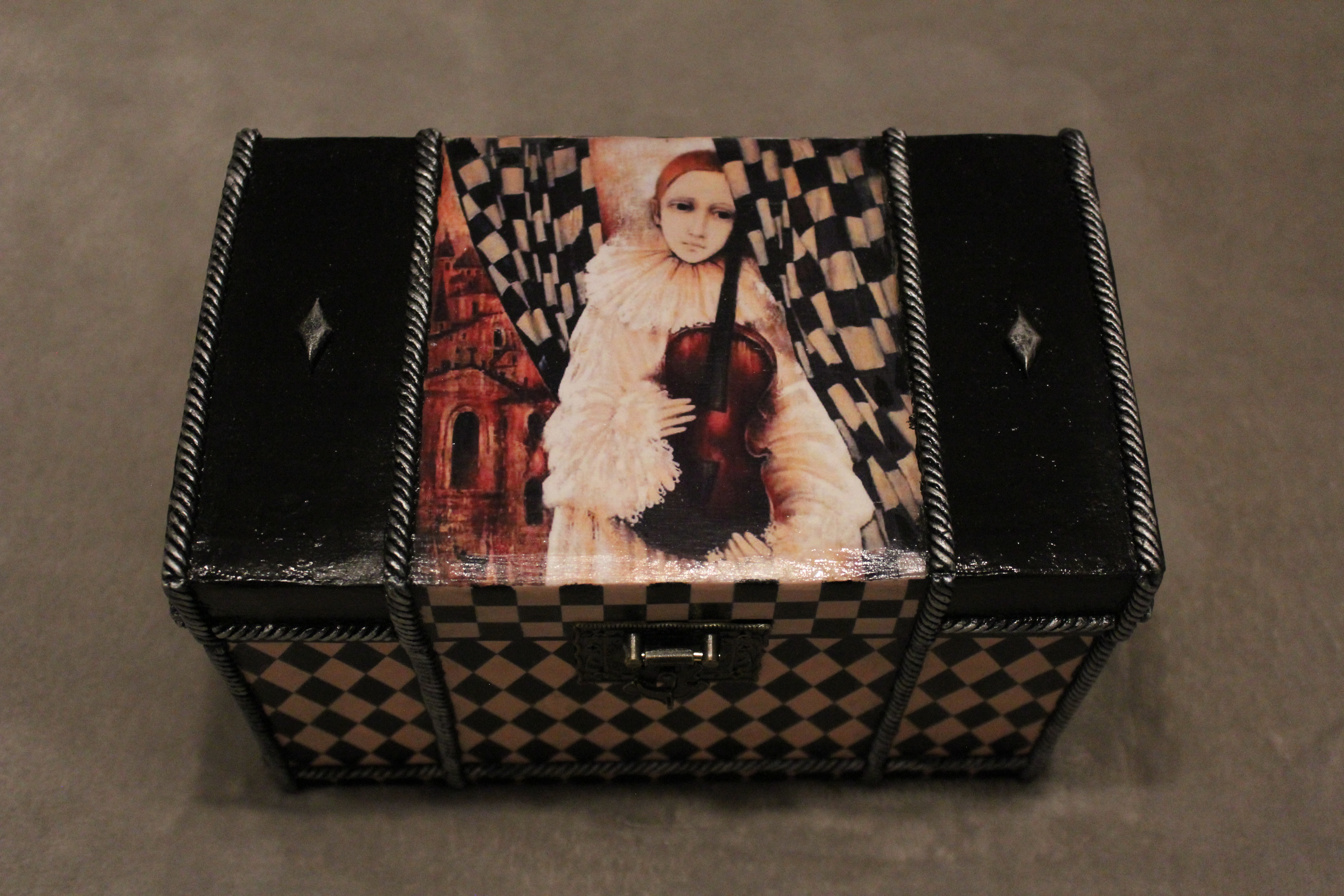 Шкатулка из картона- я обычно делаю двойные стенки, которые потом обклеиваю газетой, что придает крепость шкатулке. Затем шпаклевкой создаю относительно ровную повехность, шкурю и покрываю грунтом. Теперь можно декупажить. Распечатки на боковинах я вживила, а на крышке истончила и приклеила на клей Mod Podge.Украсила жгутиками из самотвердеющей глины. Внутри обклеила фоамираном.