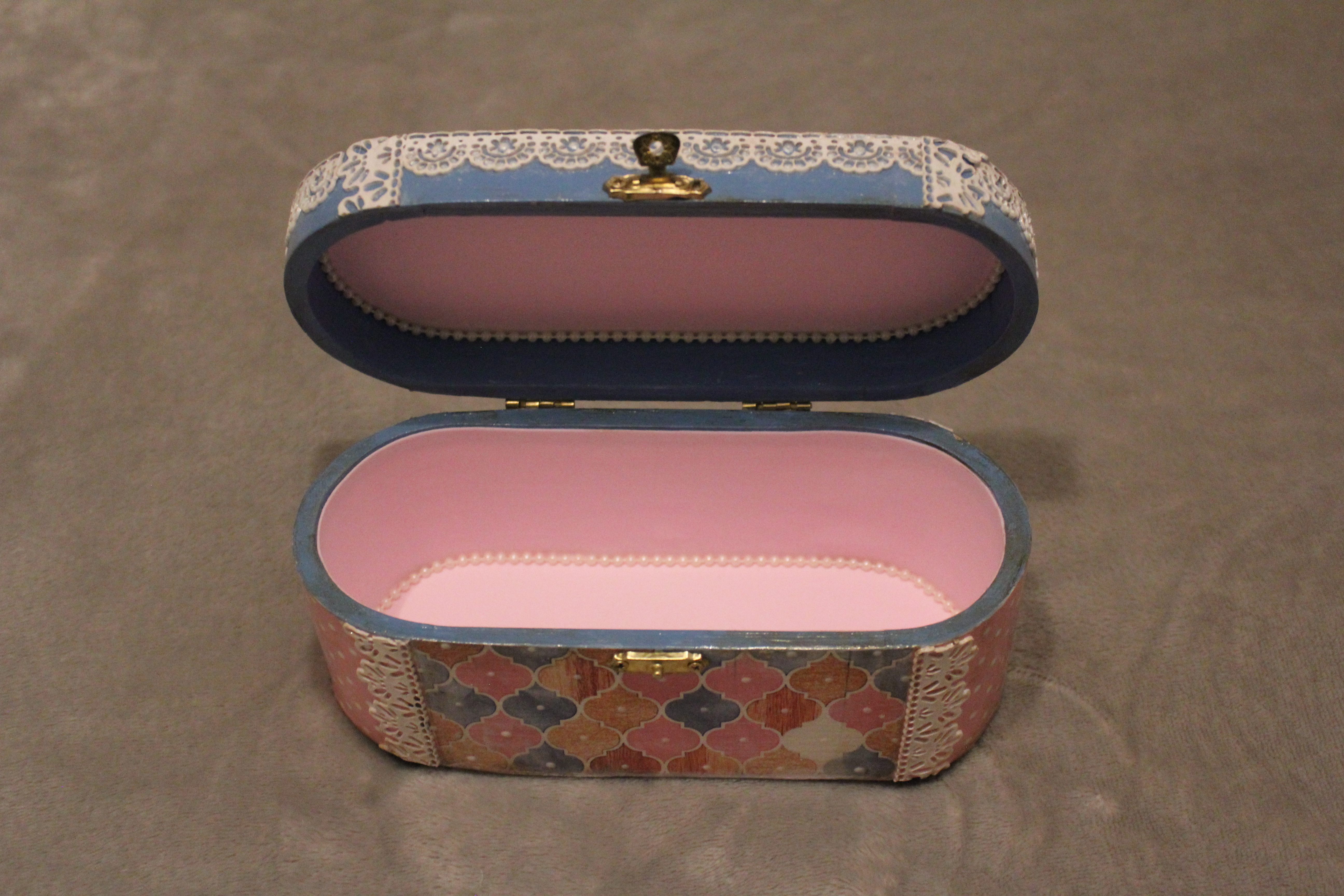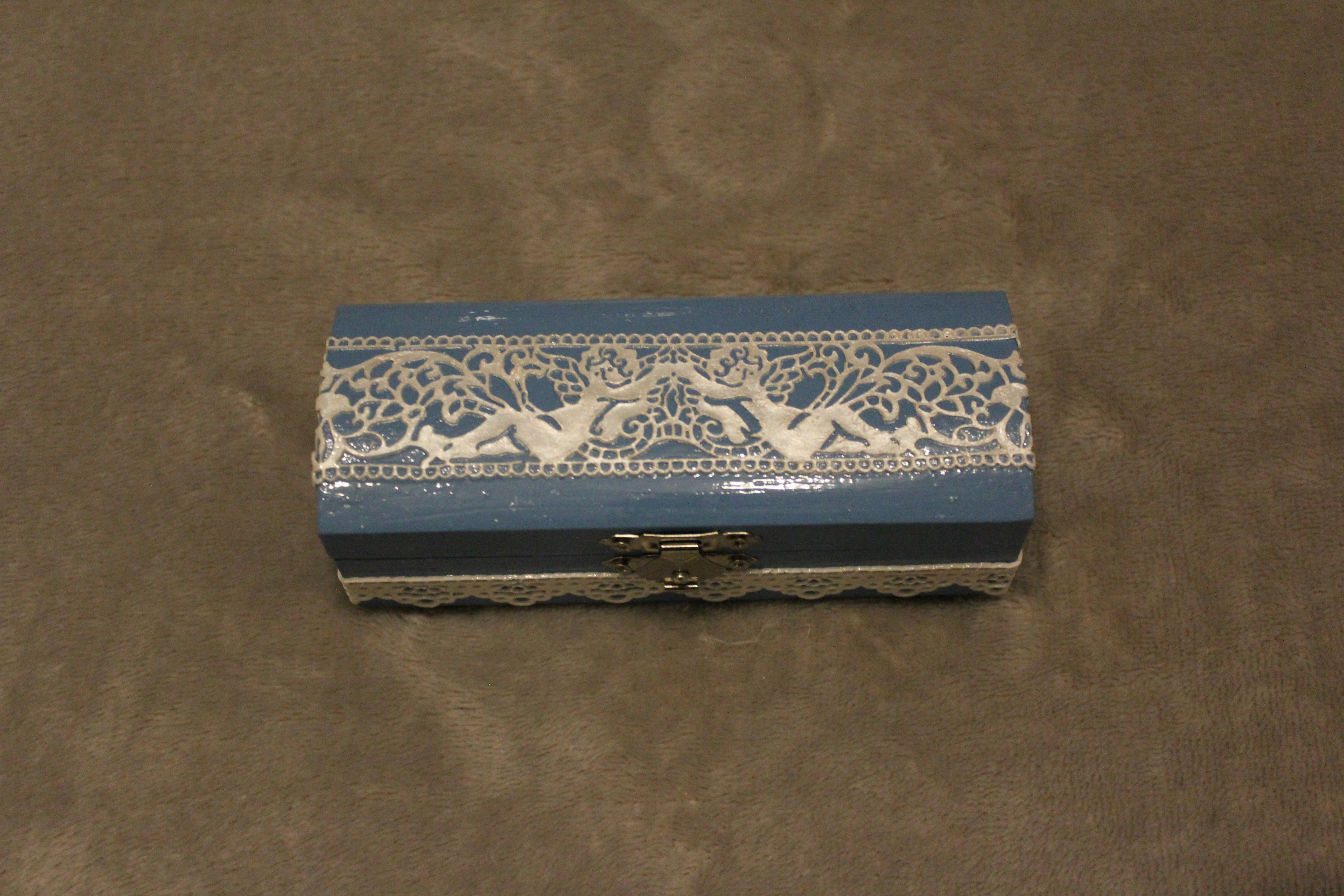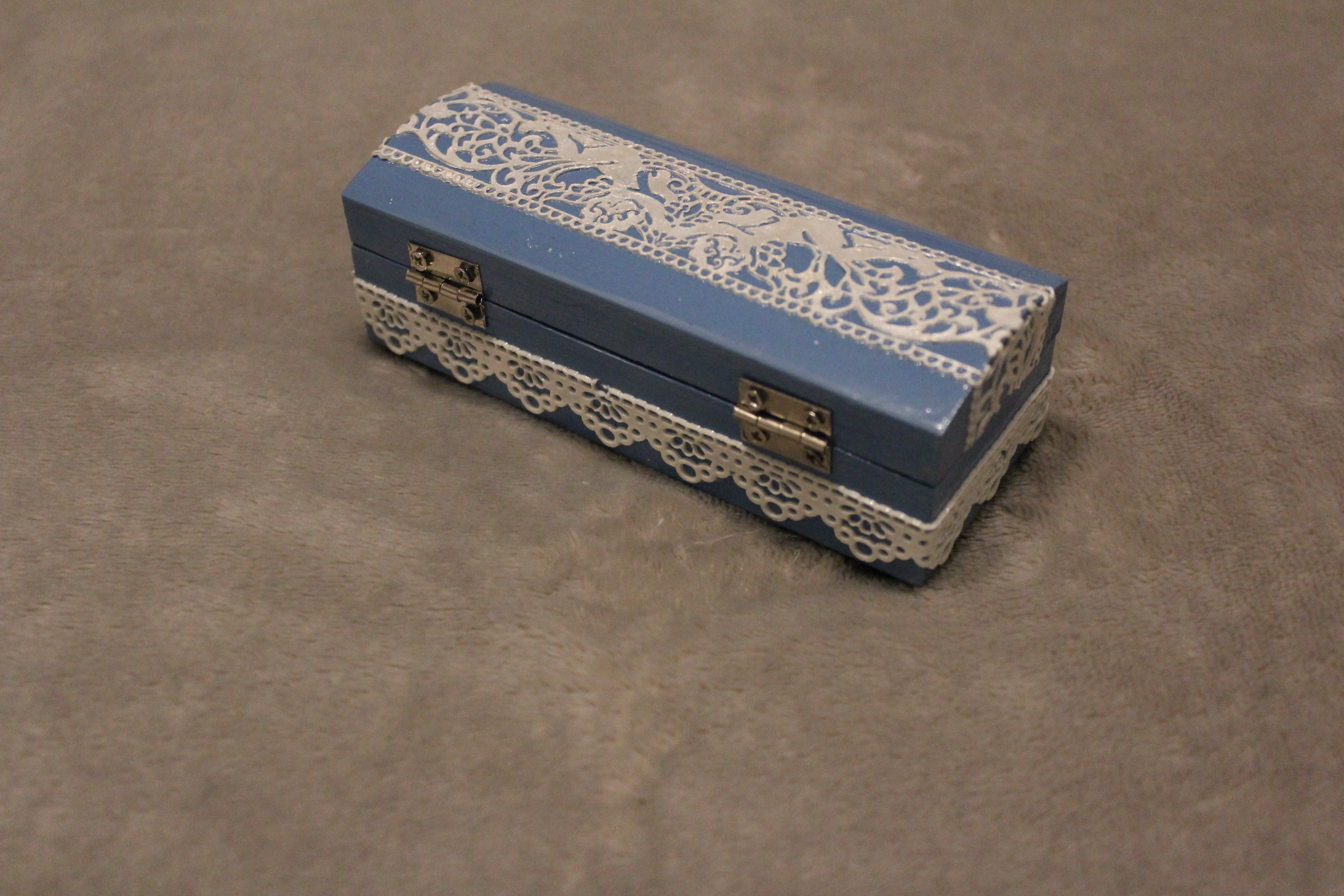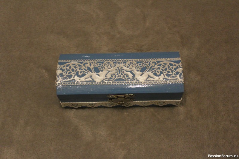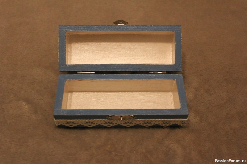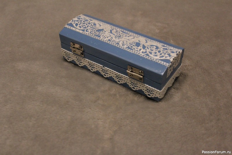 Маленькая шкатулочка, которую тоже декорировала литым кружевом, приклеянную на смолу. Внутри покрасила жемчужным белым цветом.