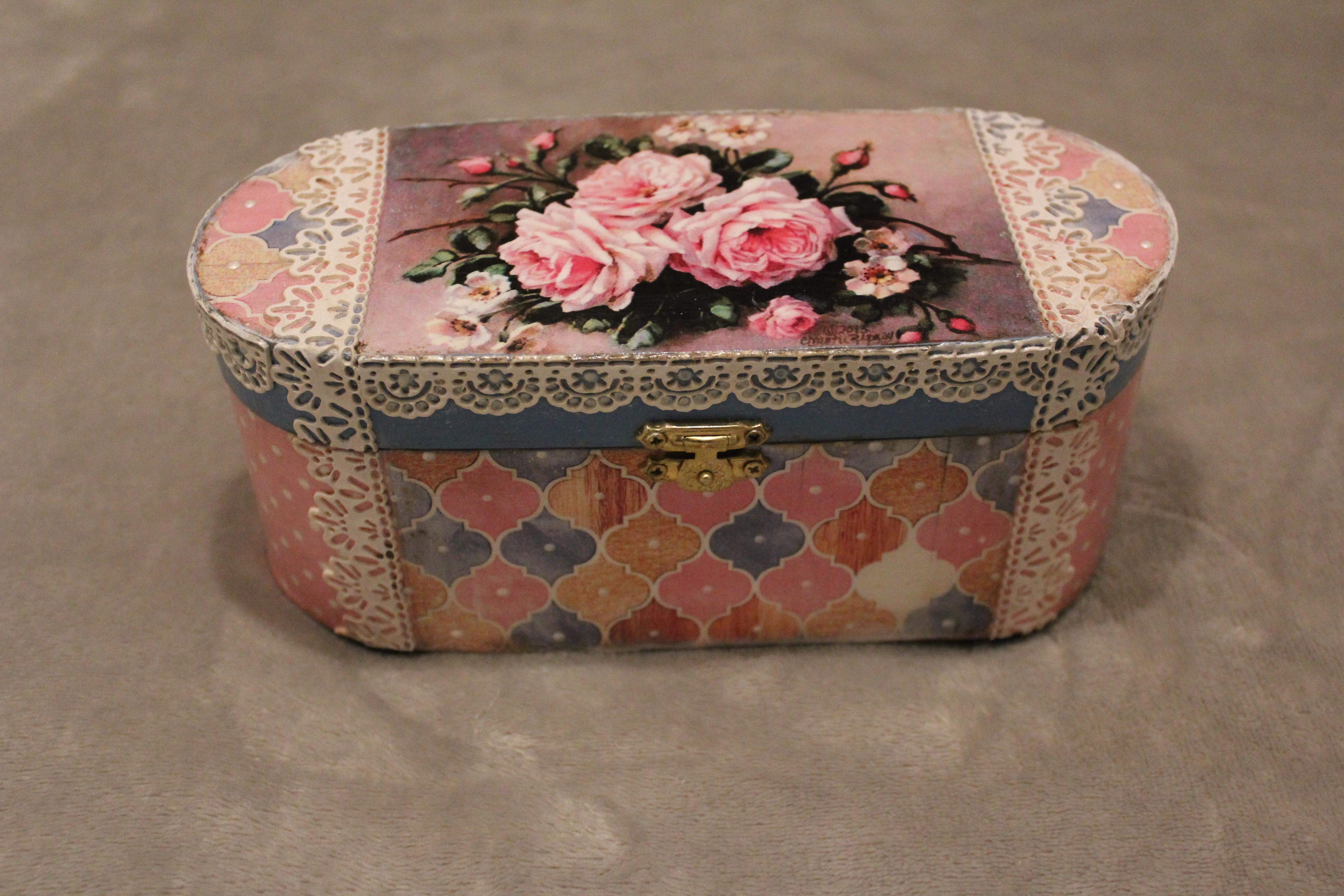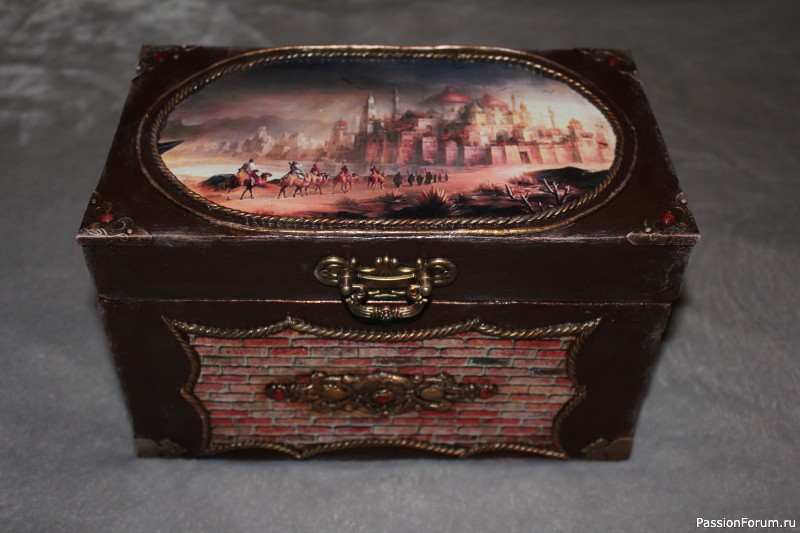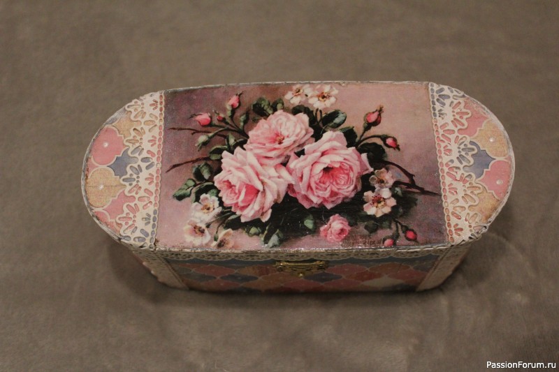 Эта шкатулка из дерева- здесь распечатки и литое кружево, которое я приклеила на эбоксидную смолу. Только там, где будет кружево я нанесла тонким слоем смолу и приложила кружево- отлично приклеилось и смотрится красиво и аккуратно. Совсем чуточку я состарила битумом и покрыла готовую работу лаком. Внутри - фоамиран и цепочка из бусинок. Ножки из самотвердеющей глины.