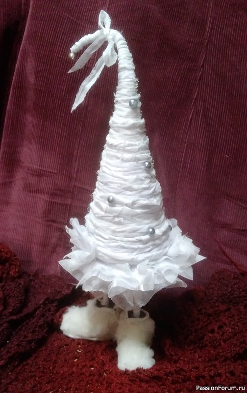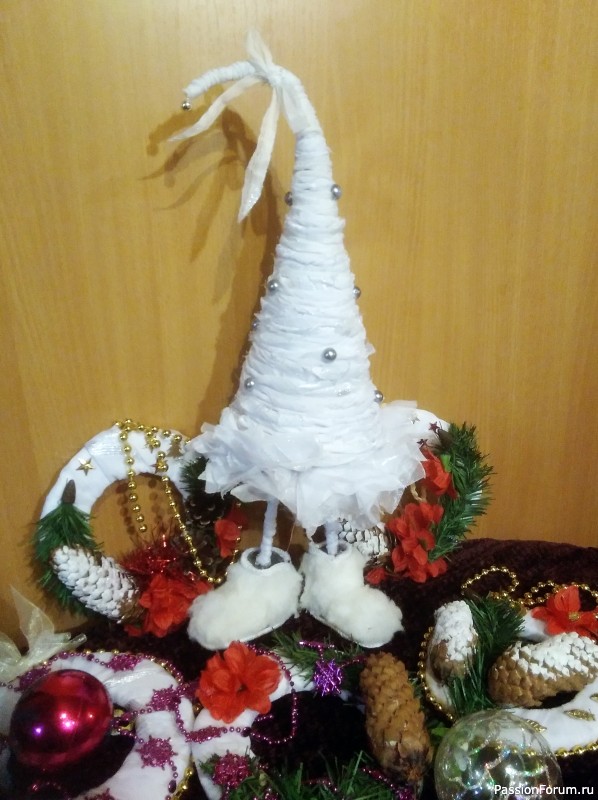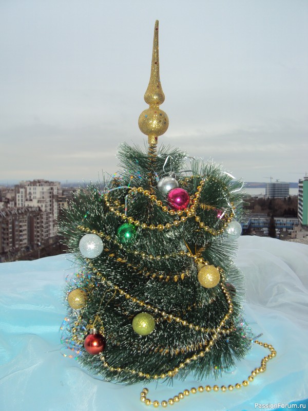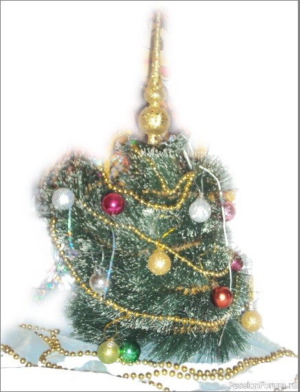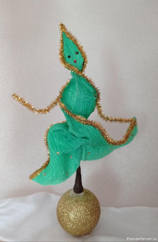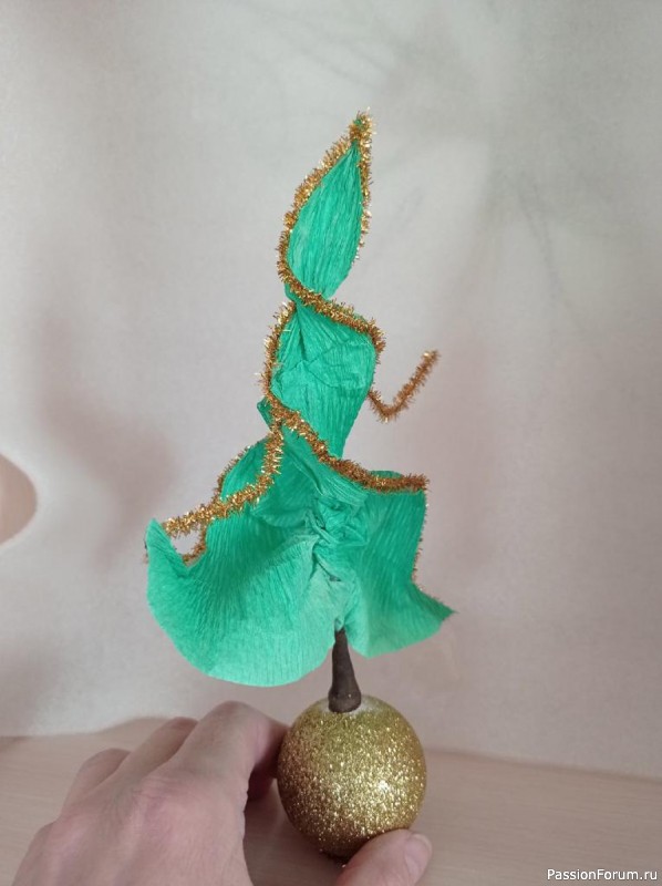 Елочка на шаре ( танцующая елочка - неваляшка).Материал гофробумага, тейплента, синельная проволока, шарик, гипс, блестки и стразы от алмазной мозаики.
