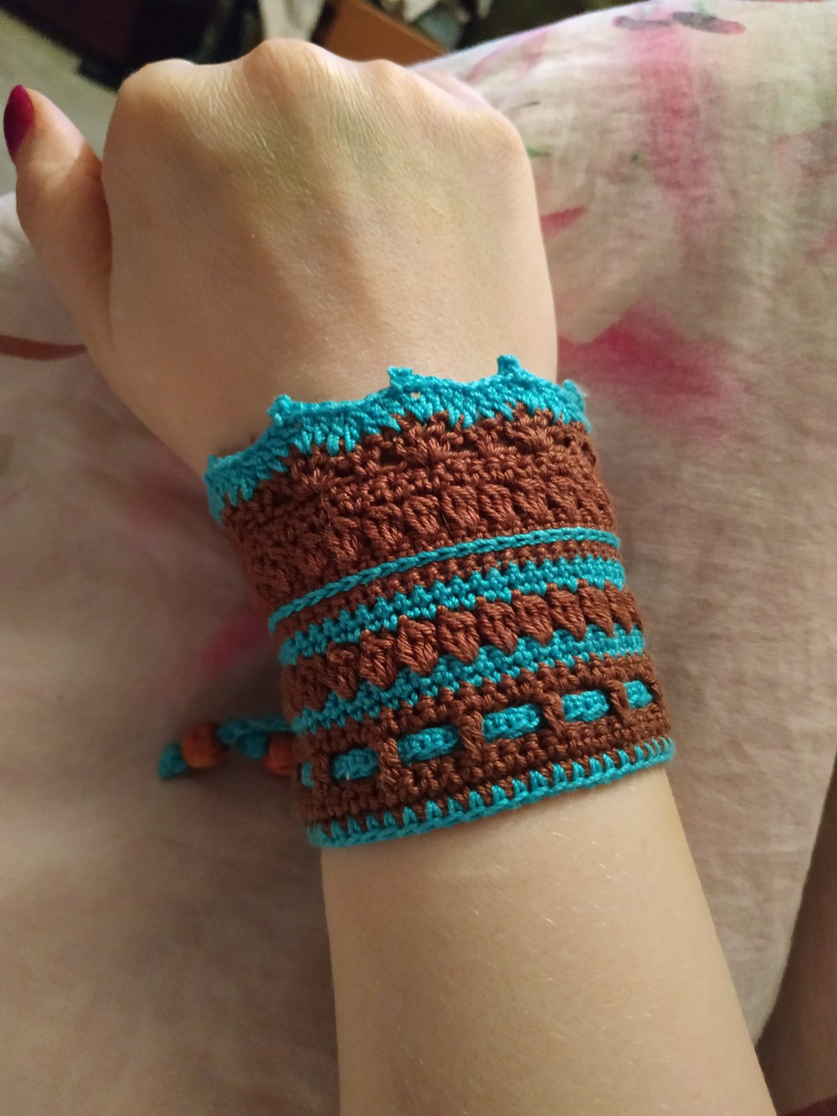 Манжет, браслет в бохо стиле. Выполнен крючком из мерсеризованного хлопка.