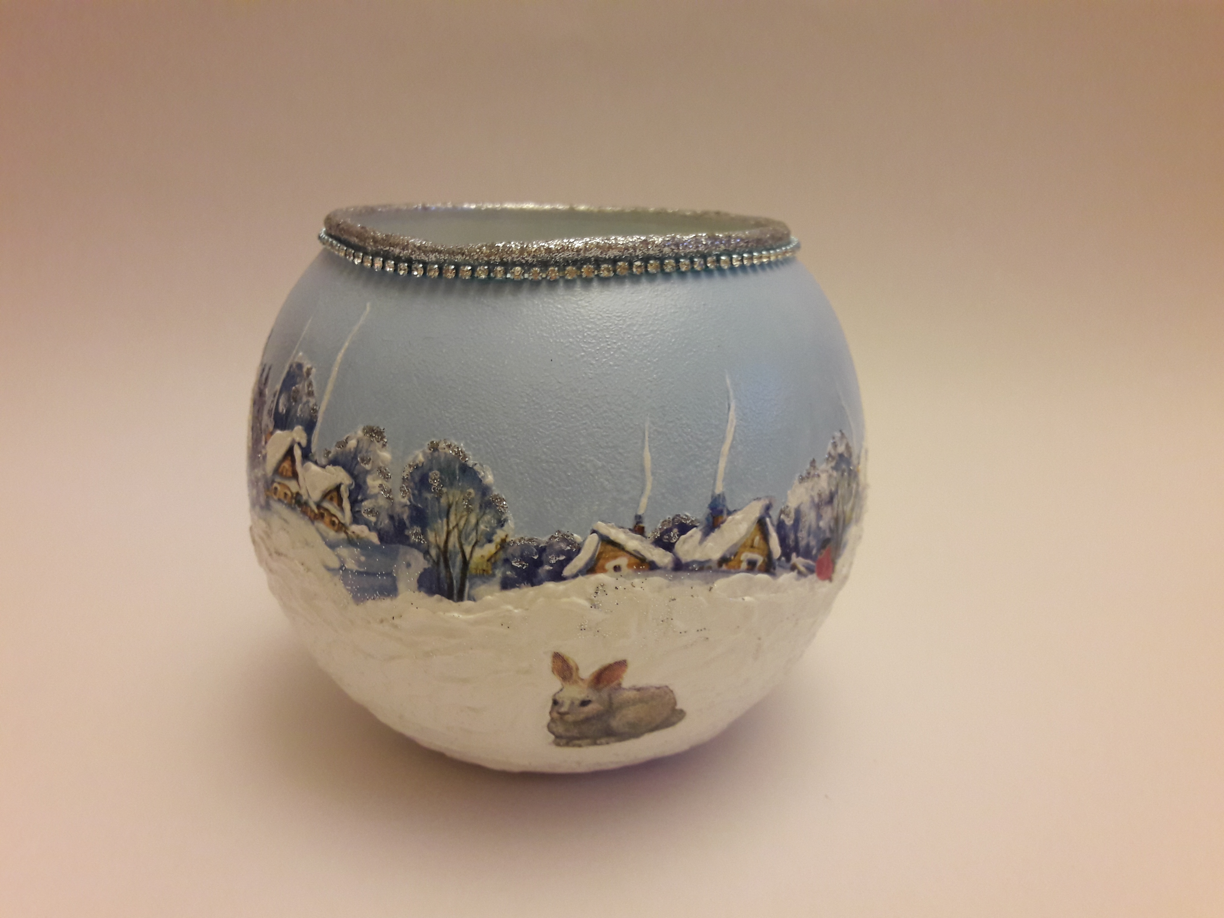 В заключении на сегодня, но надеюсь что не совсем, хочу представить вам свой новогодний подсвечник, который сделала из маленькой стеклянной вазочки. Получился он у меня прям зимний. Зажжем свечку на новый год.