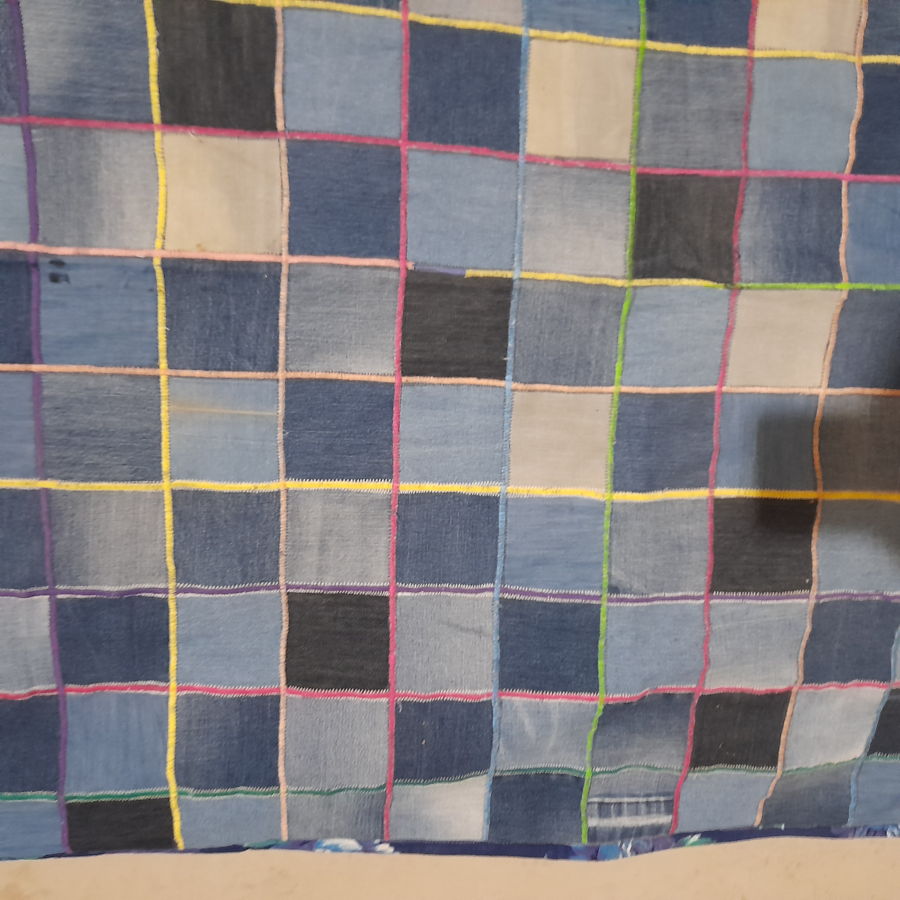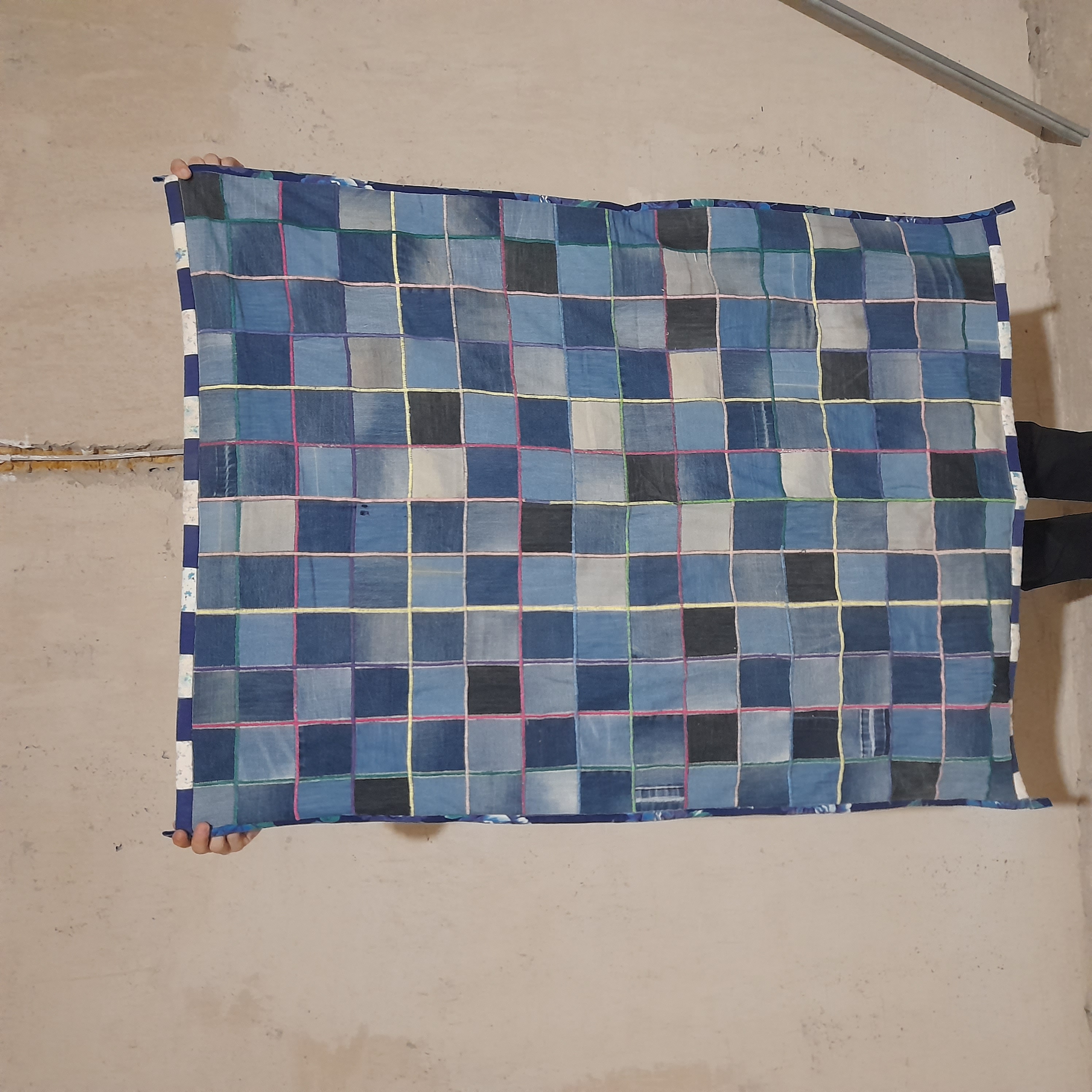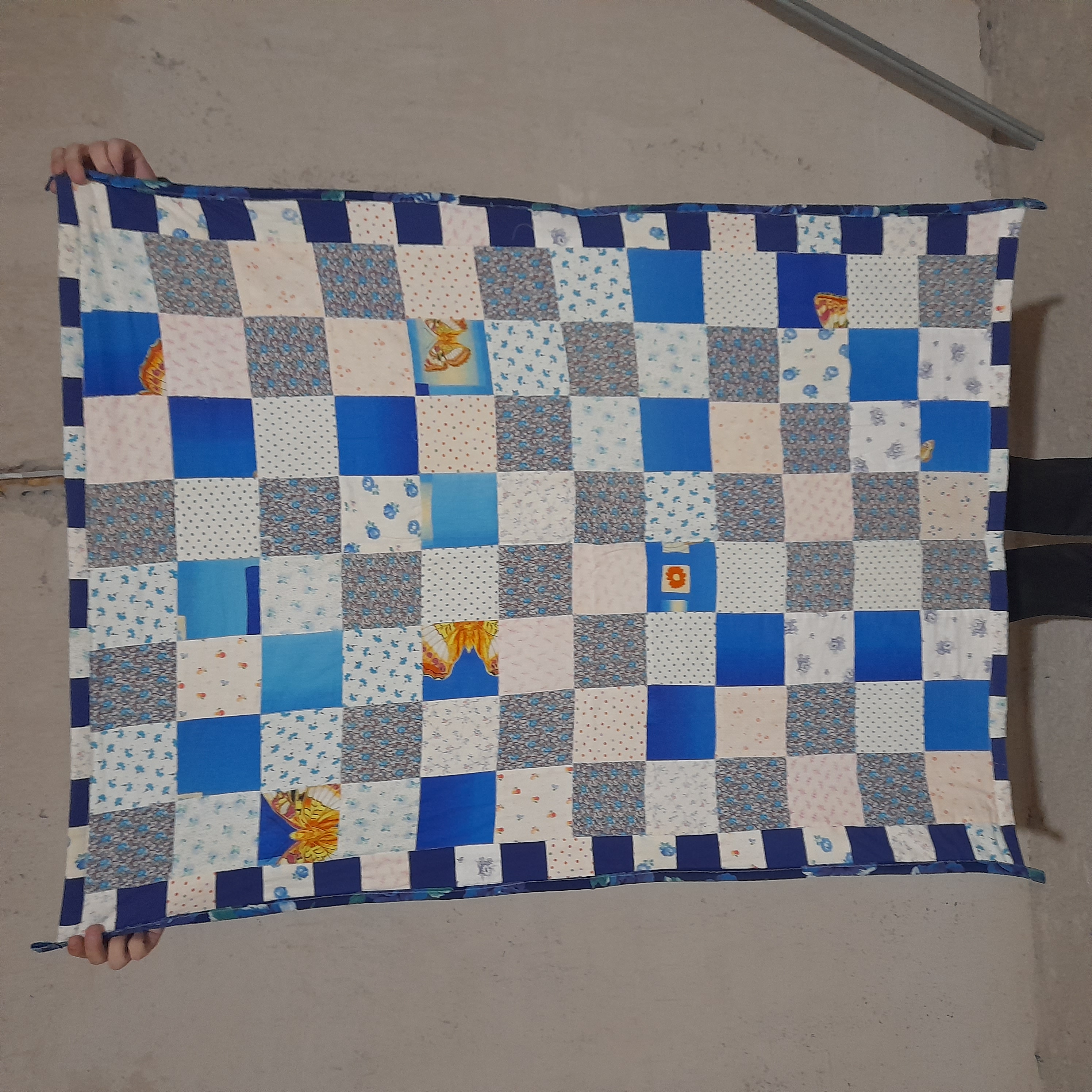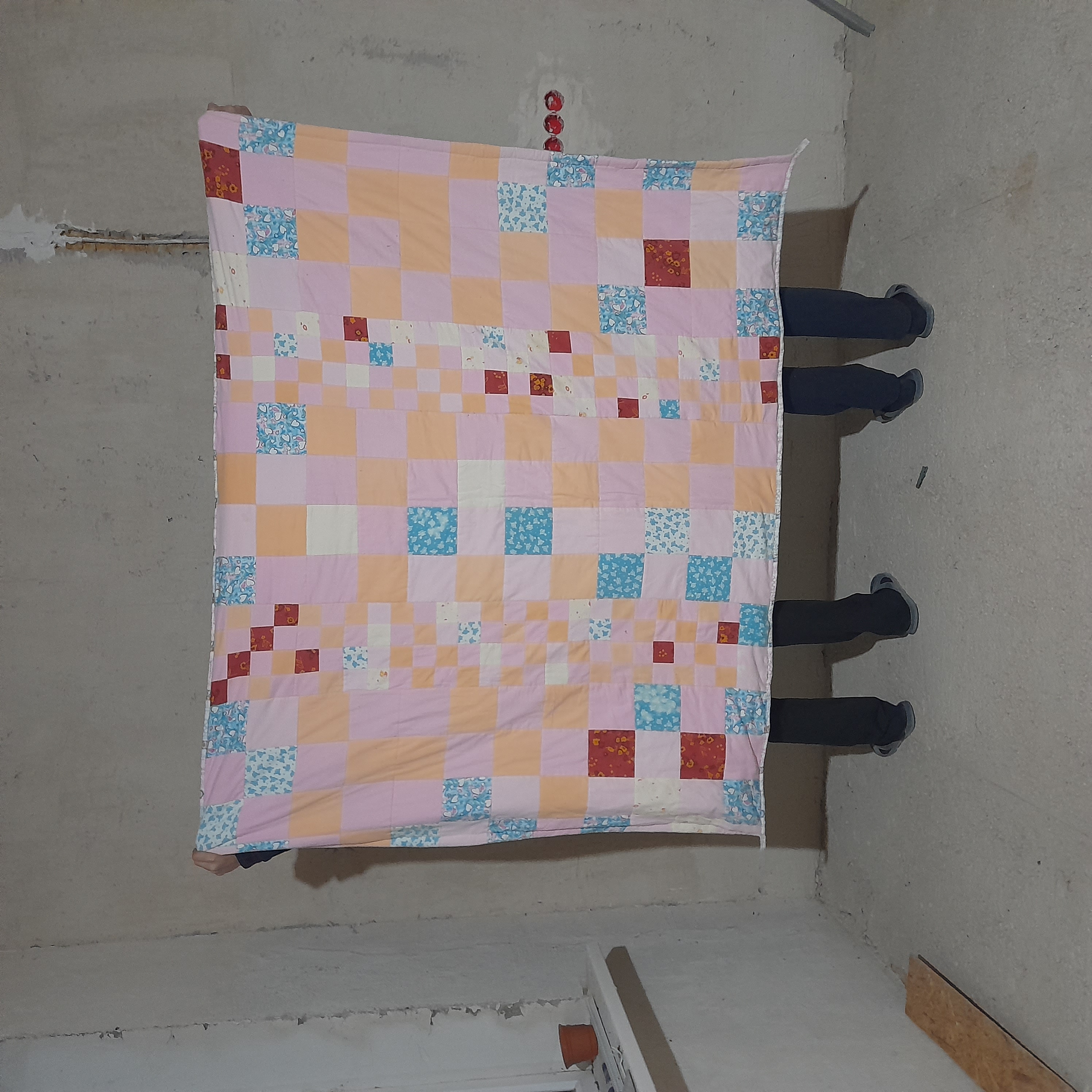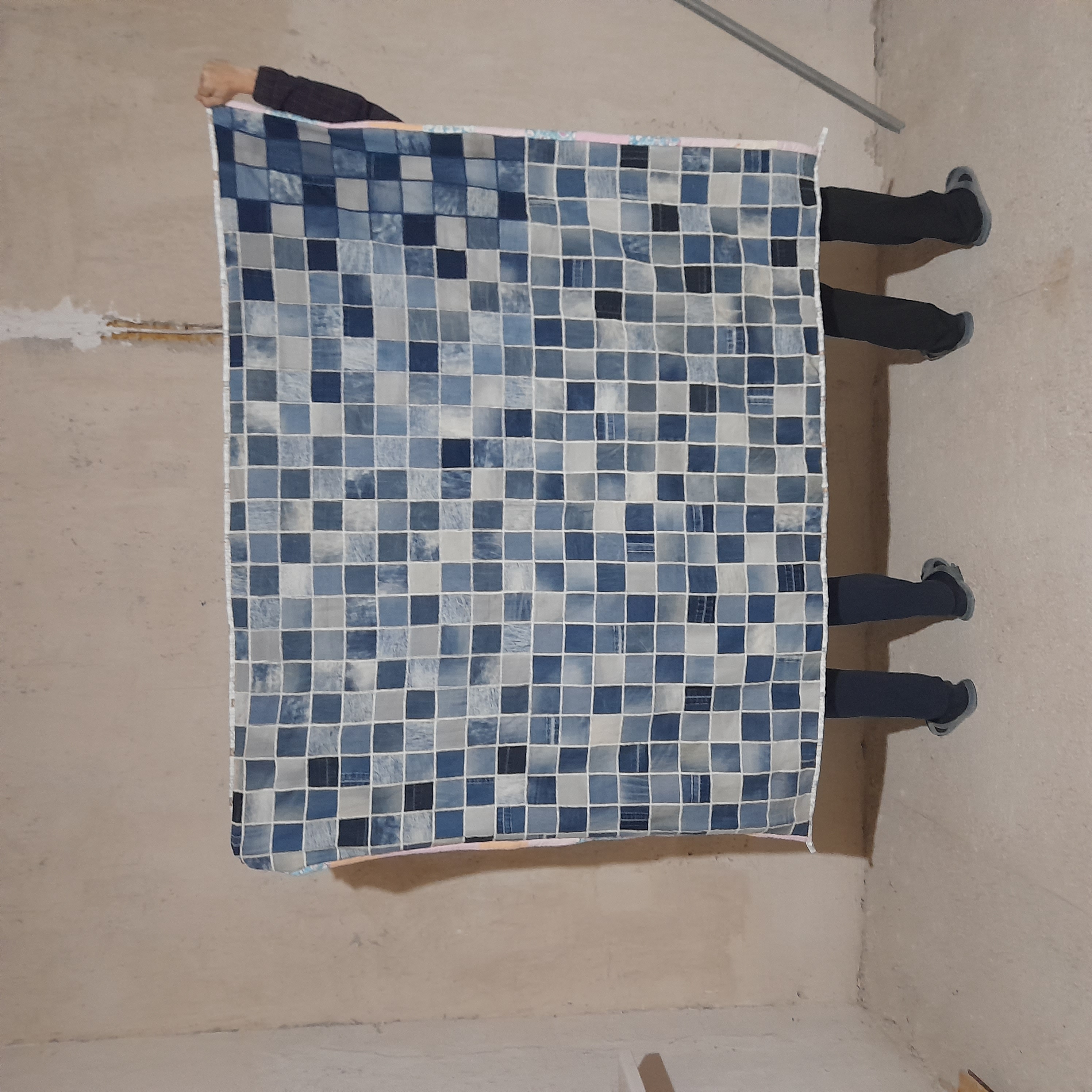 Здравствуйте рукодельницы и рукодельники! Хвастаюсь : долгострой завершен! Комплект из двух покрывал: большое 160×190 см и маленькое 100×140 см. Принцип - не выбрасывать, а перерабатывать. Как видите, лицевая сторона покрывал джинсовые квадратики. Это уже классика. (Уверена, у каждого пара-тройка джинсов имеется, это самый распространенный вид штанишек.) Старые выбросить жалко, многие меня поймут. И для всяческих переделок - то что надо. Тыльная сторона - тут интереснее. В большом покрывале это (сама ржу) сынулькины фланелевые пеленки-распашонки-ползунки, 28 лет ожидали своей участи после прямого использования. В маленьком покрывале тоже пеленки-распашонки, но ситцевые. Уплотнение и утепление - тоже "привет из 80-х" ватин.