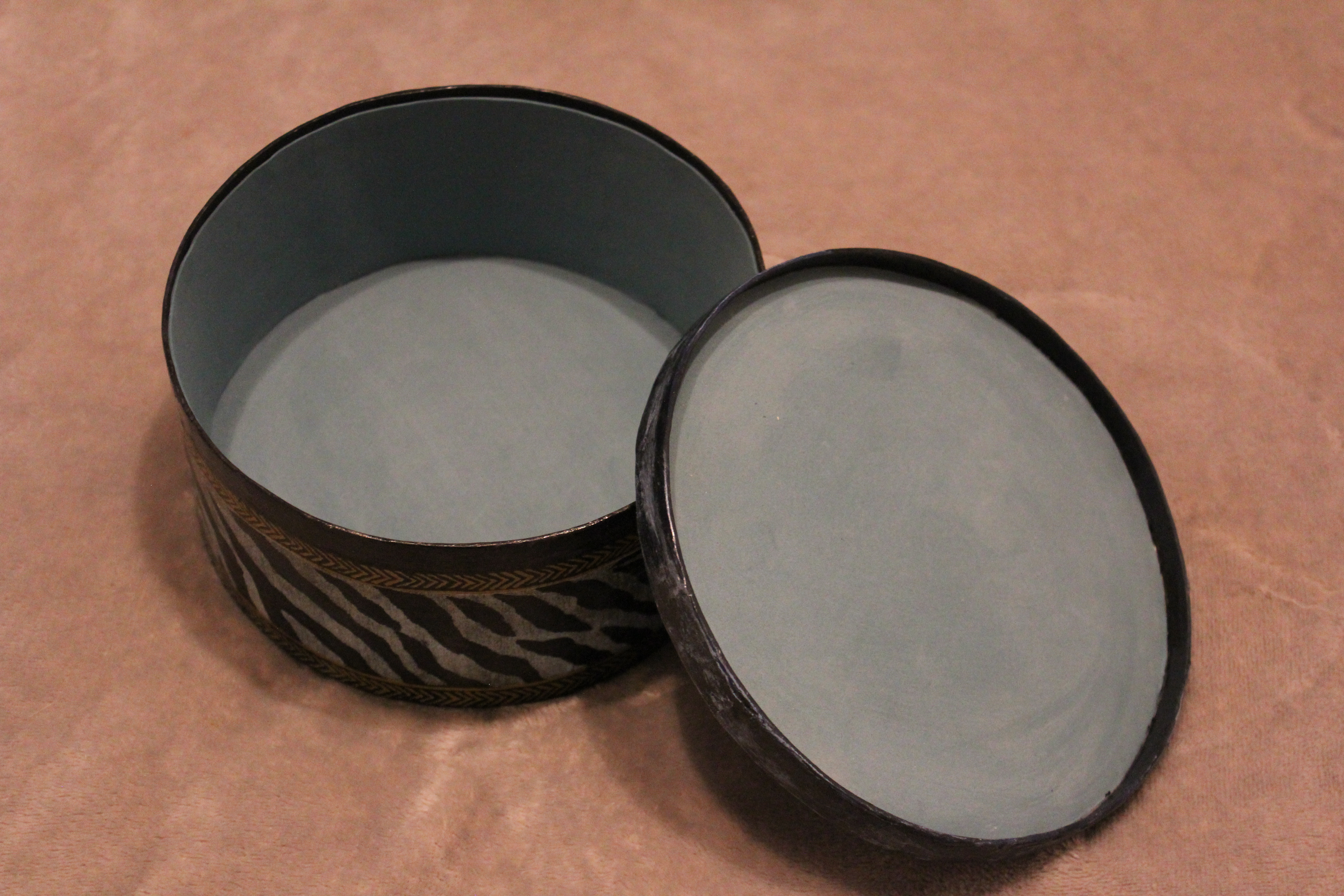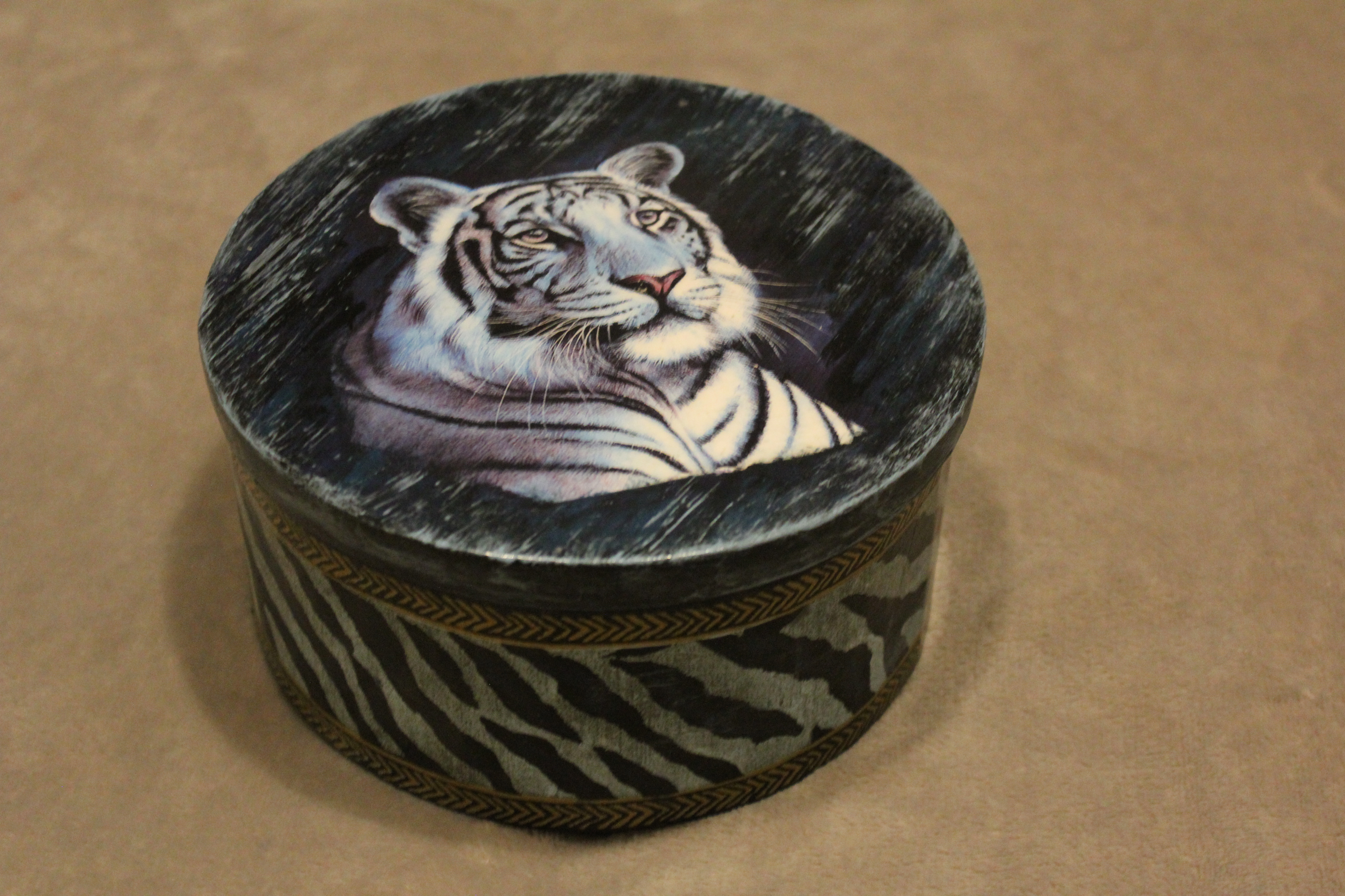 Сделала шкатулку для елочных игрушек и посвятила ее хозяину 2022 года - Тигру! Надеюсь он будет к нам всем радушен и добр. А сделать такую шкатулку было совсем не сложно. Для этого понадобилась круглая коробка из картона, салфетка и распечатка с тигром. Распечатку покрыла лаком 2 раза, истончила и приклеила на загрунтованную белой краской крышку. Края распечатки слегка сошкурила, Салфетку с бело-черным тигриным рисунком приклеила на боковину шкатулки, предварительно покрасив ее в голубой цвет, чтобы белая часть салфетки была голубого цвета. Внутри дополнительно приклеила круглый картон на дно и крышку для твердости шкатулки, покрасила в белый цвет, а затем приклеила голубой фоамиран. Для ножек использовала самотвердеющую глину. Вокруг тигра на крышке подрисовала, покрыла всё лаком и посыпала бесцветными блесками. На фото к сожалению не видно мерцание шкатулки. На этом работа завершена и всем спасибо за просмотр.