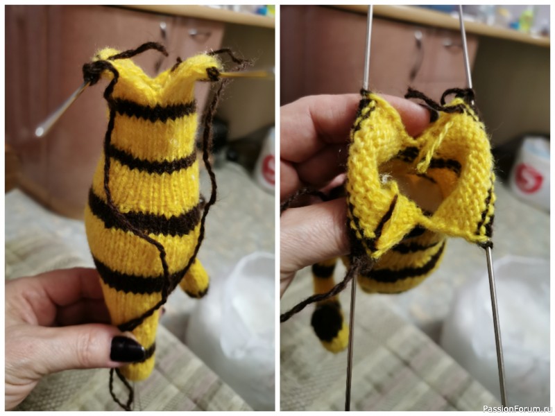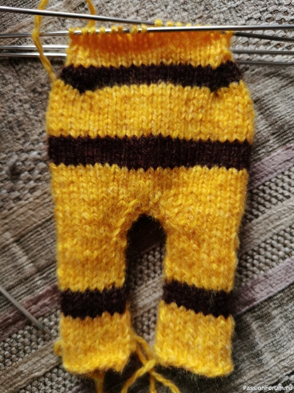 Набрала 15 петель жёлтого акрила и начала вязать ножки.Через 10 кругов(после коричневой полоски)начала прибавки,по 1 петли через круг.
